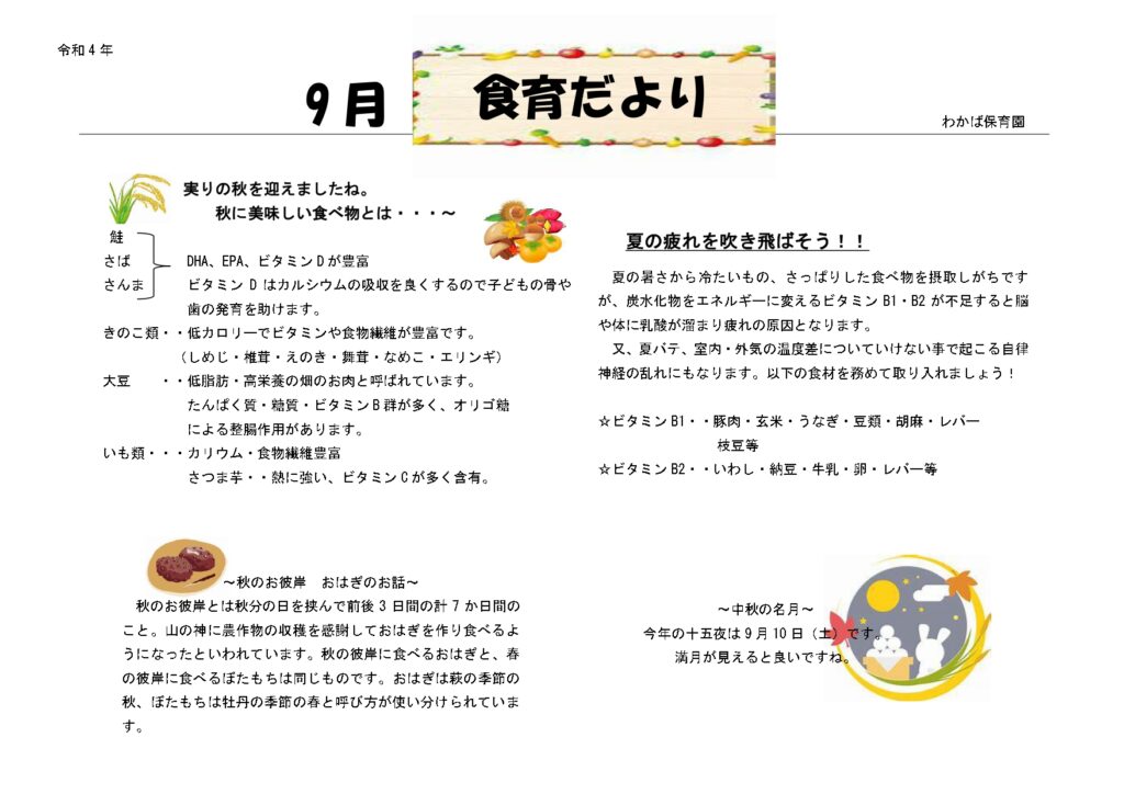9月の献立表と食育だよりを掲載致しますのでご覧下さい。