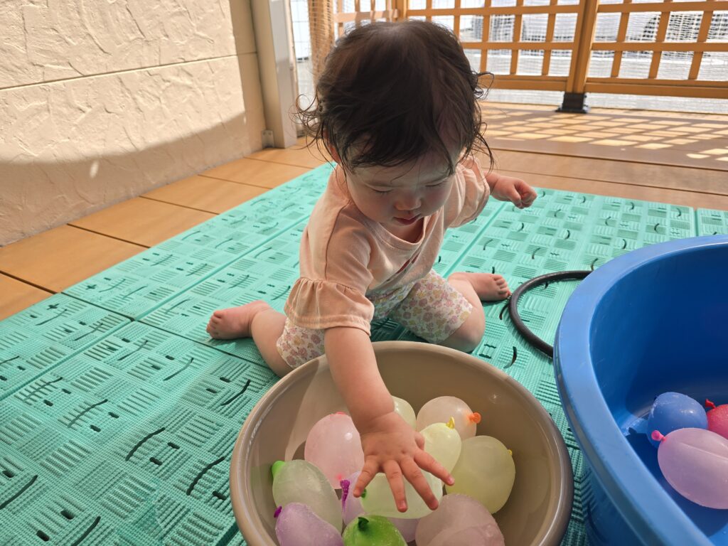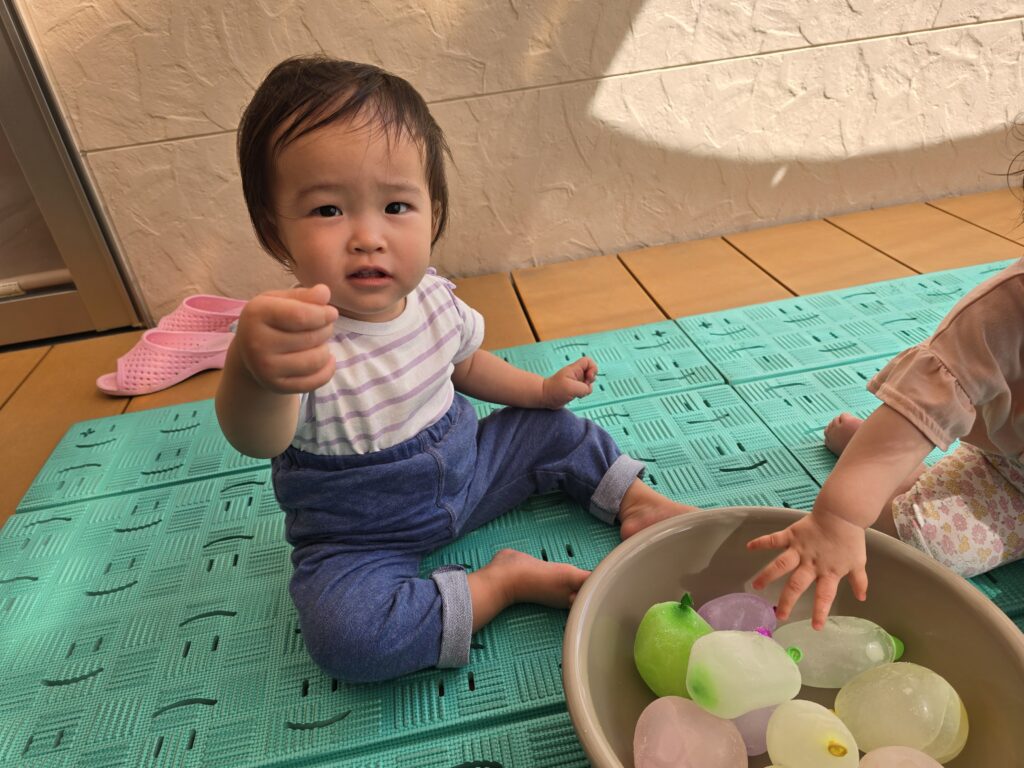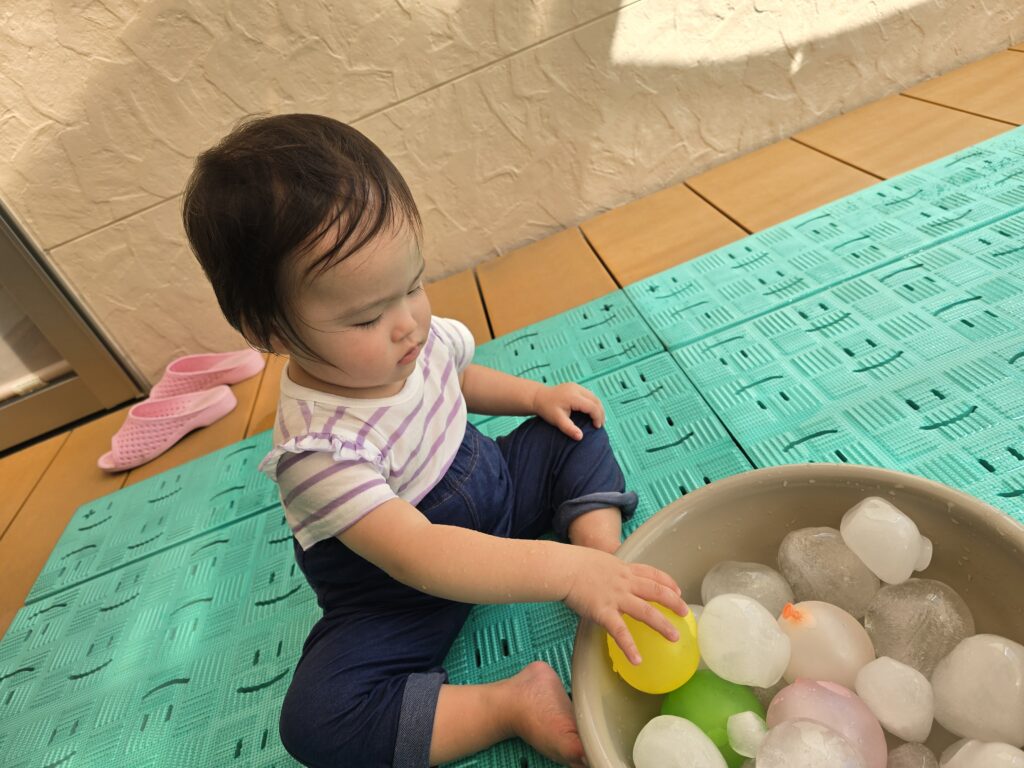 氷遊びは興味を示し、触って冷たさを感じたり転がしたりして楽しんでいました。