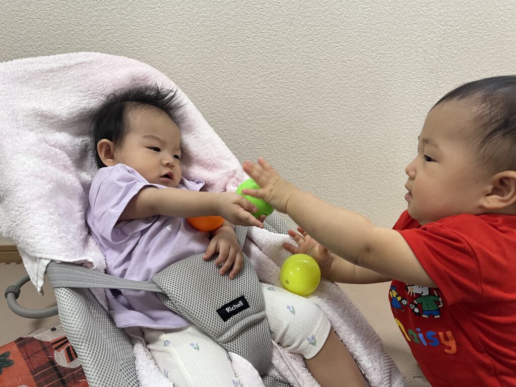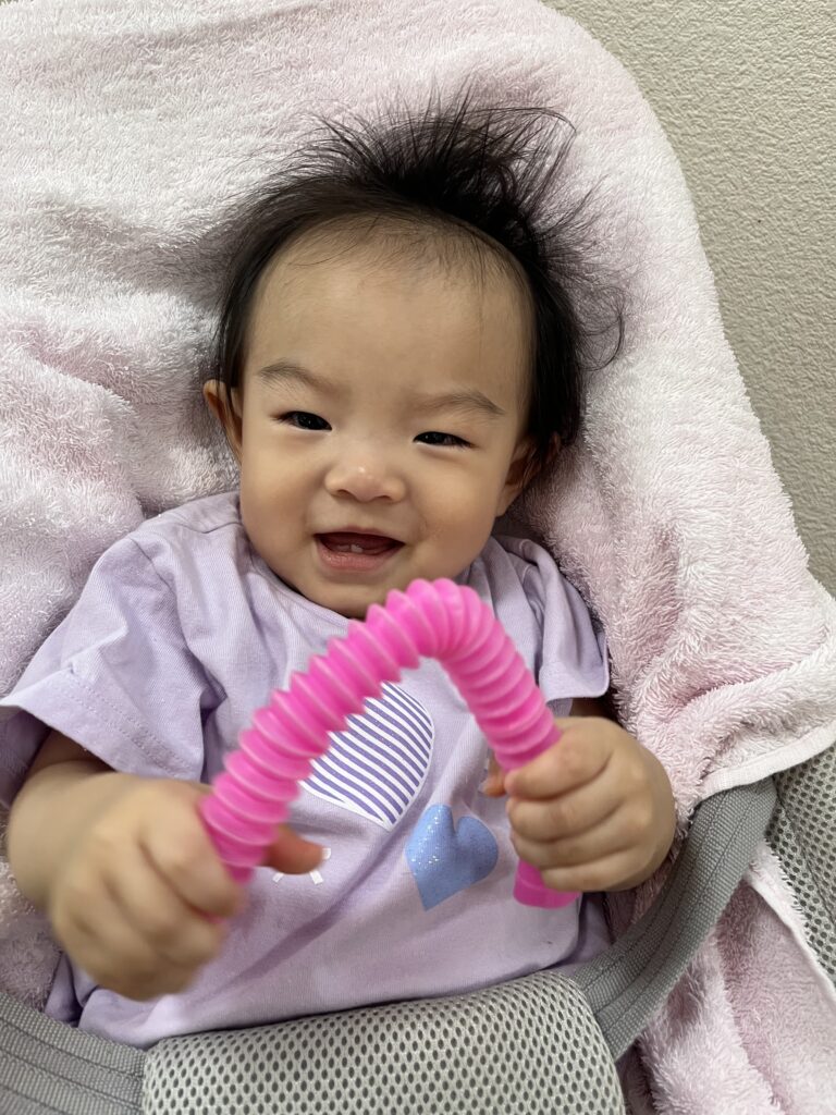 両手に持って振ったり、体を動かしたりして楽しそうにしていました。