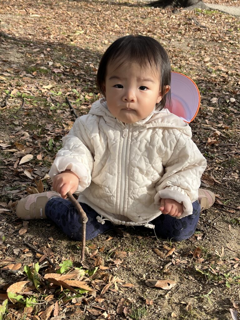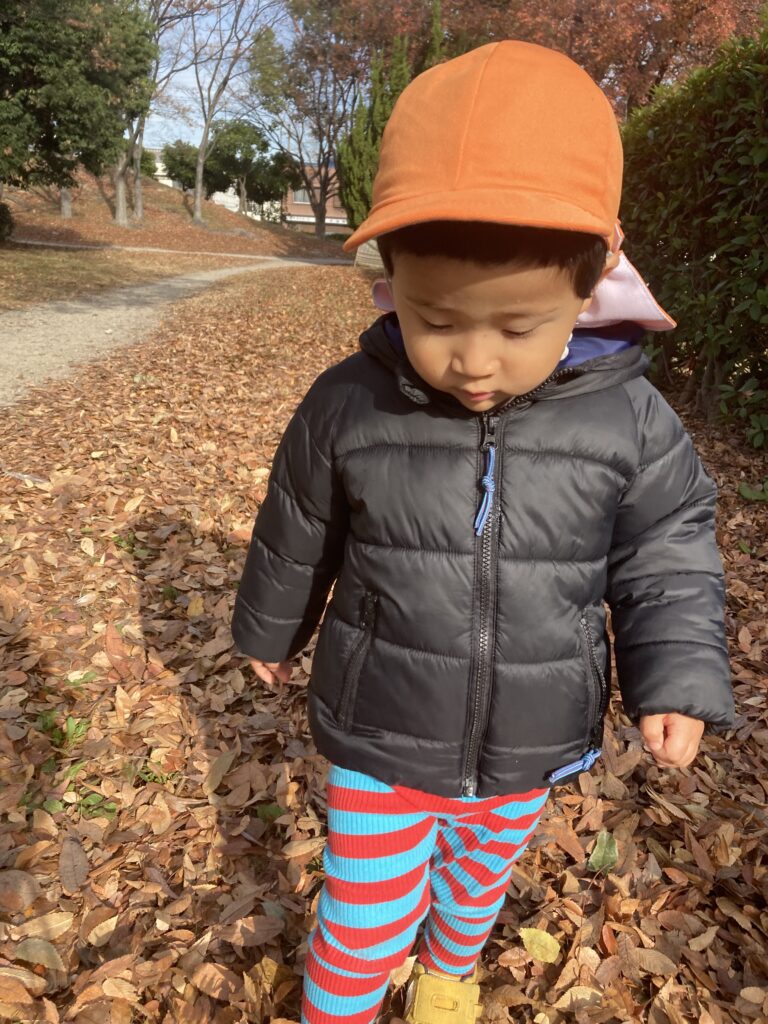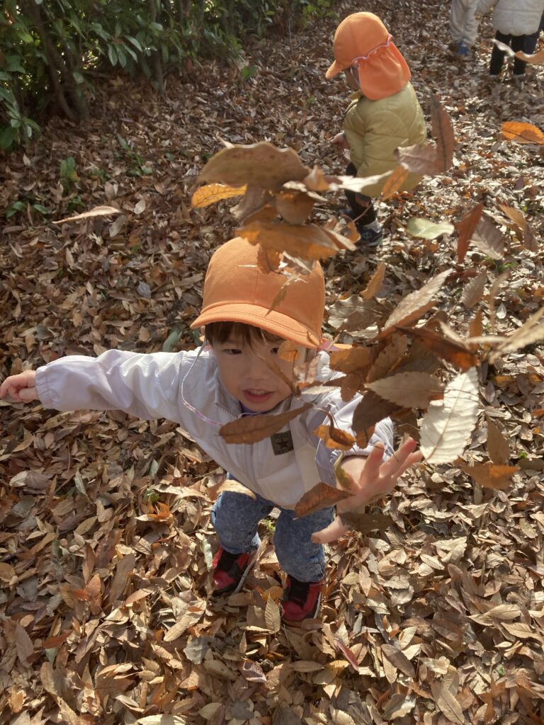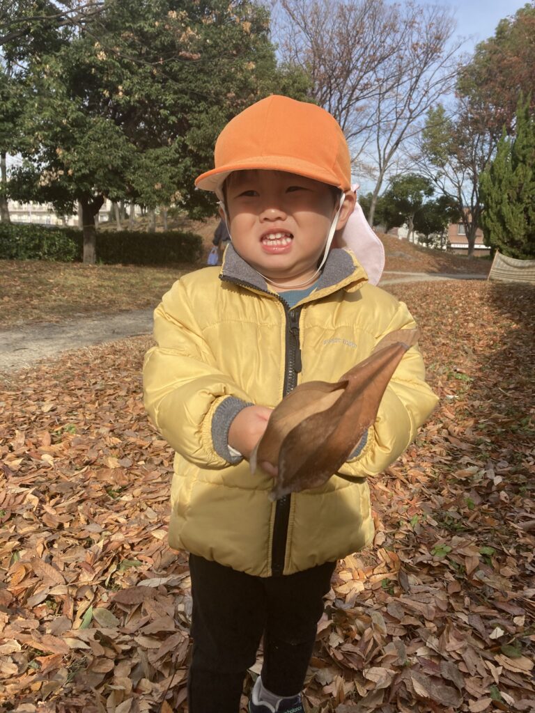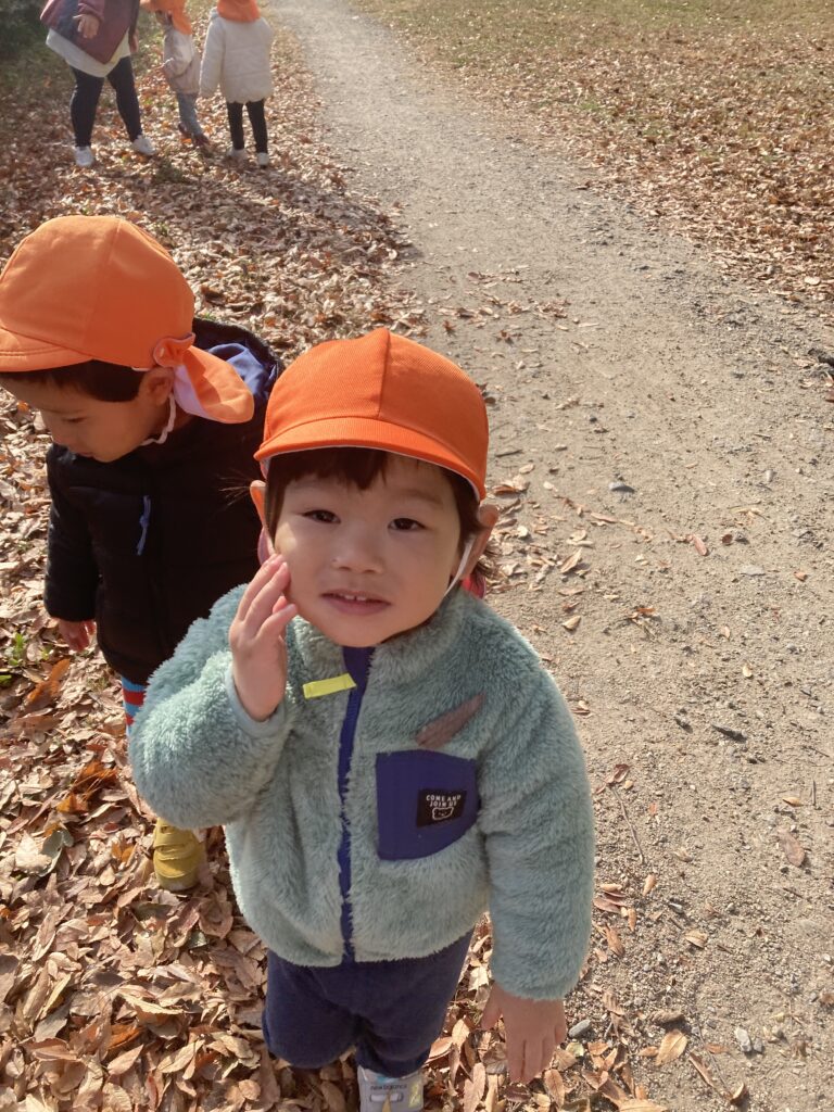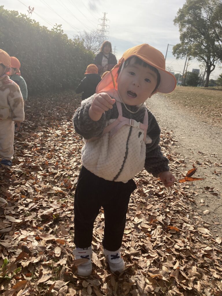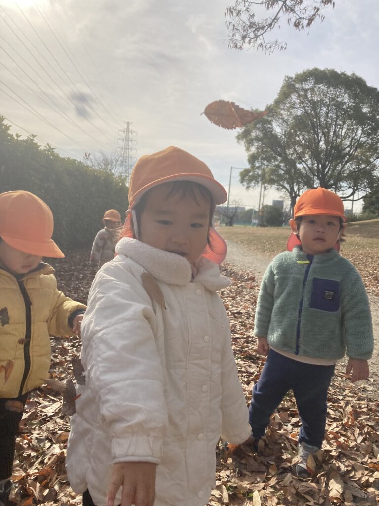 公園では落ち葉や木の枝を拾ったり、手を繋いで丘を登ったりして楽しく過ごしました。