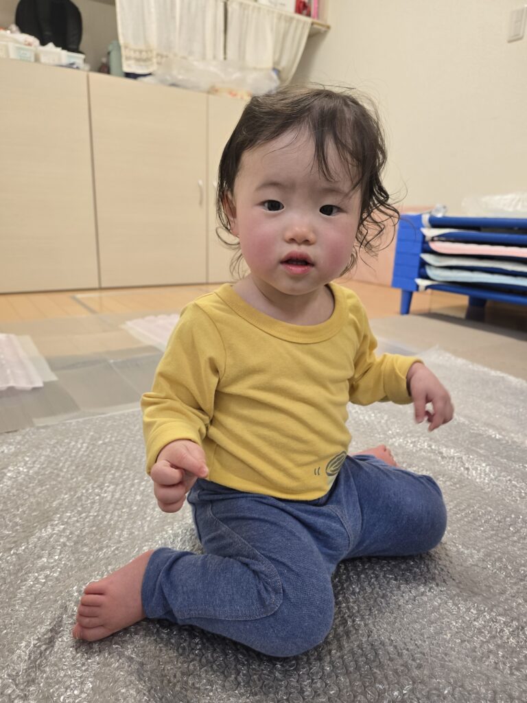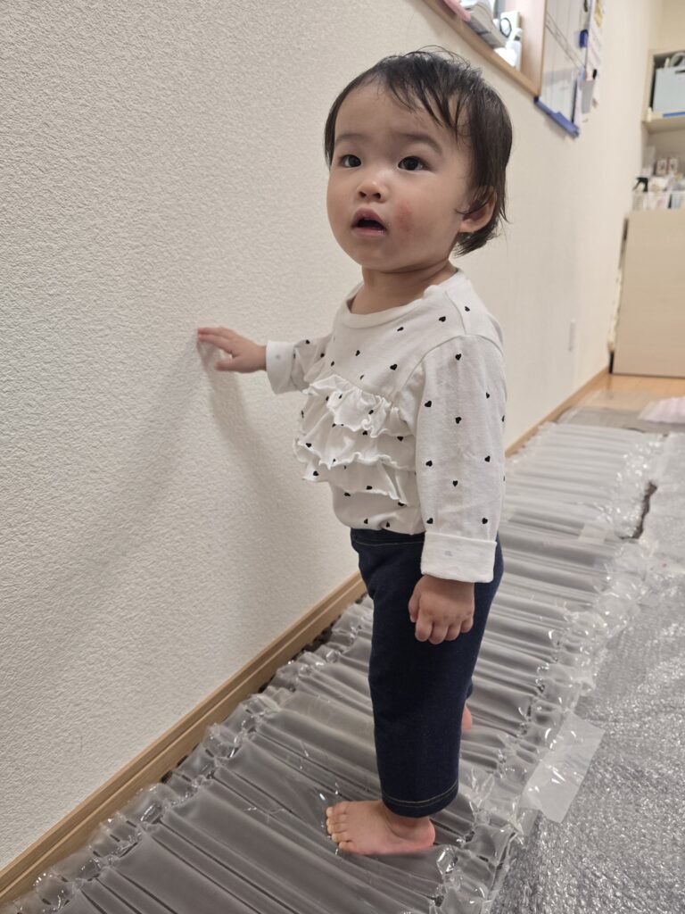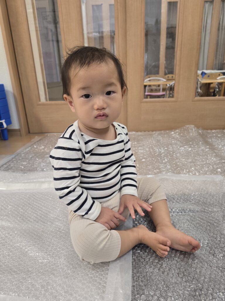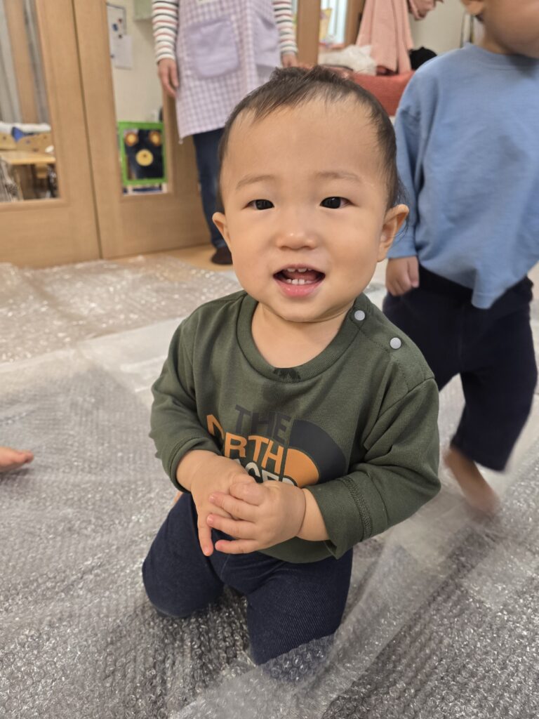 今日はお部屋に緩衝材を敷き詰めて遊びました。