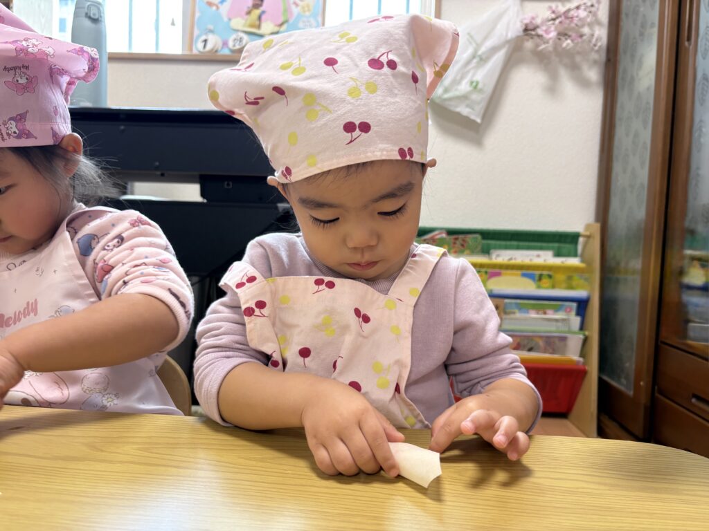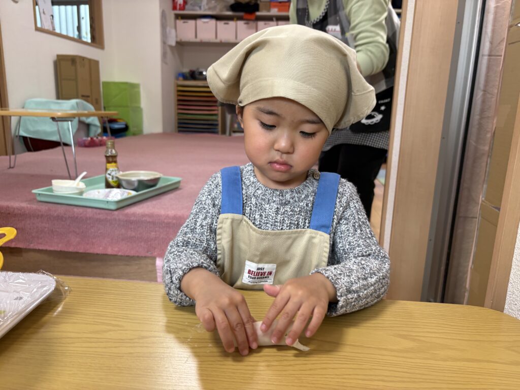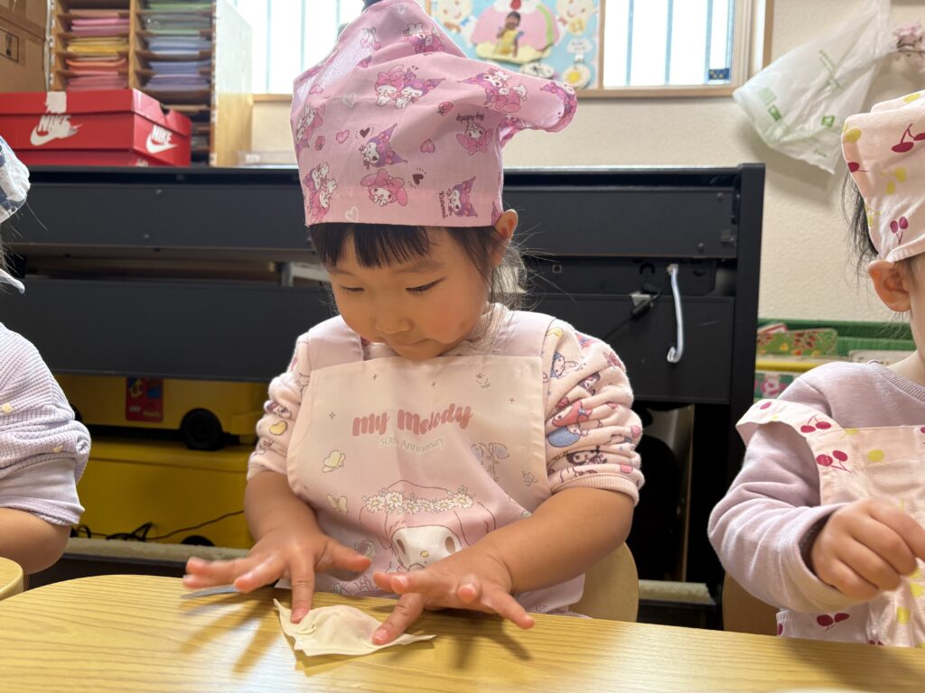 たねを包むのに苦戦しながらも、真剣な表情で一生懸命に取り組んでいた子どもたち。