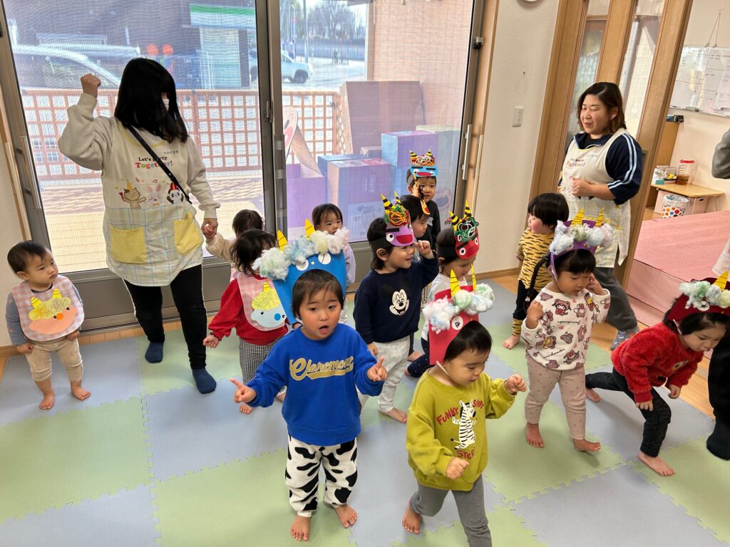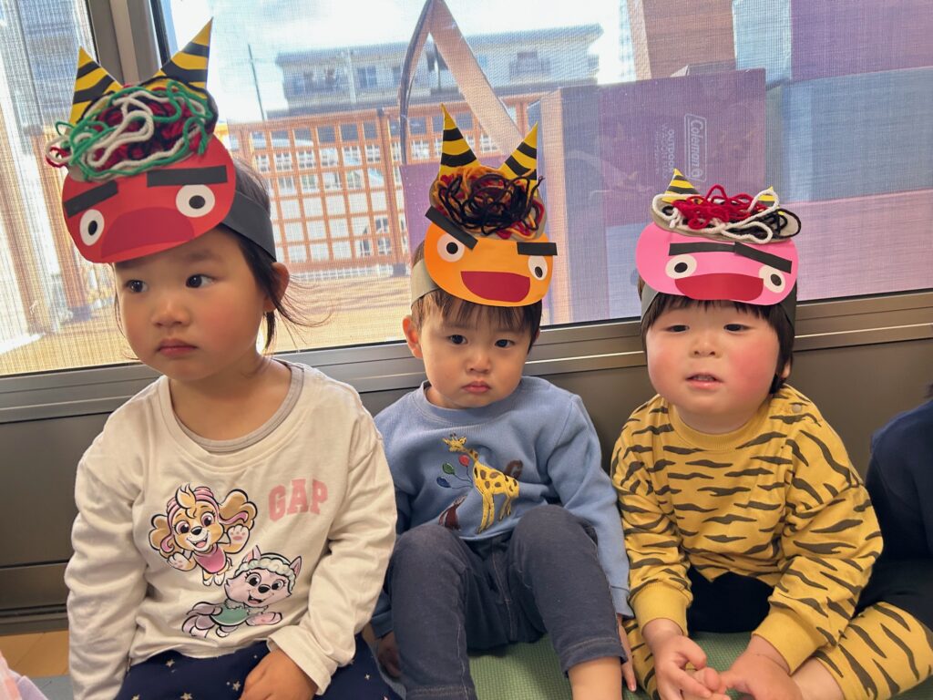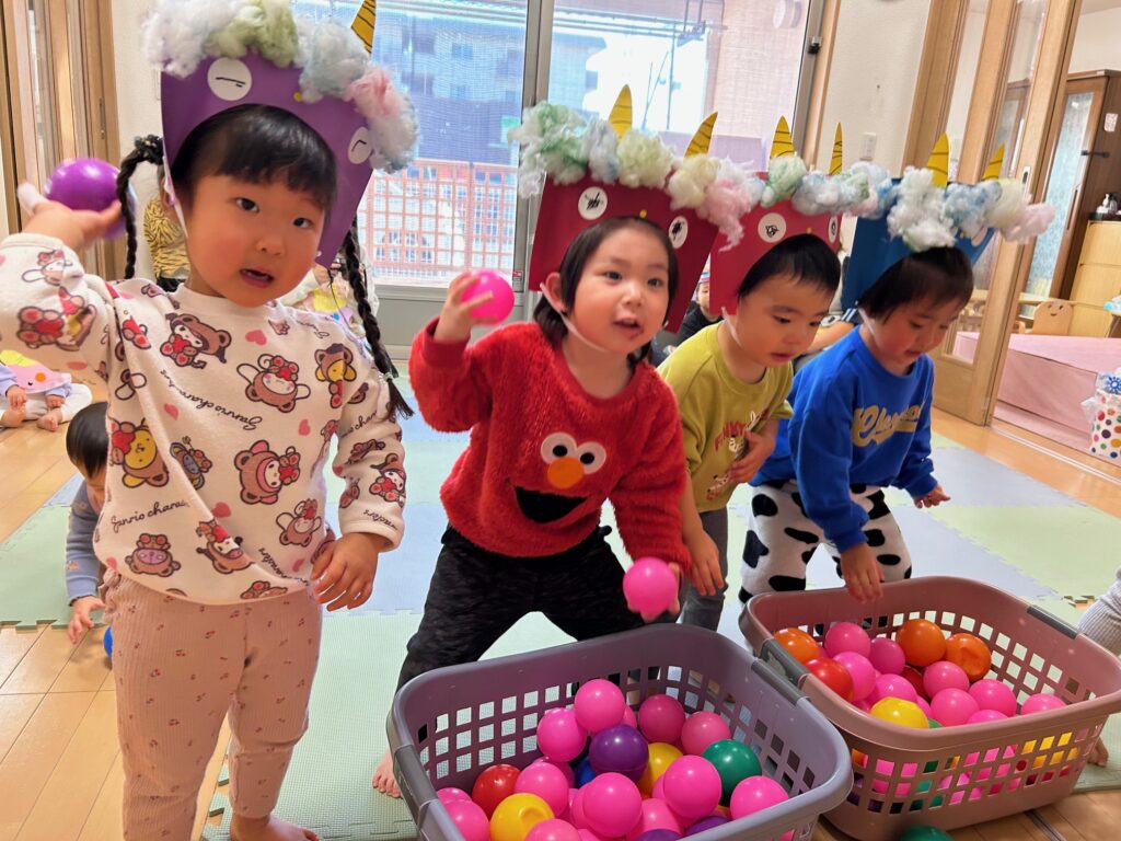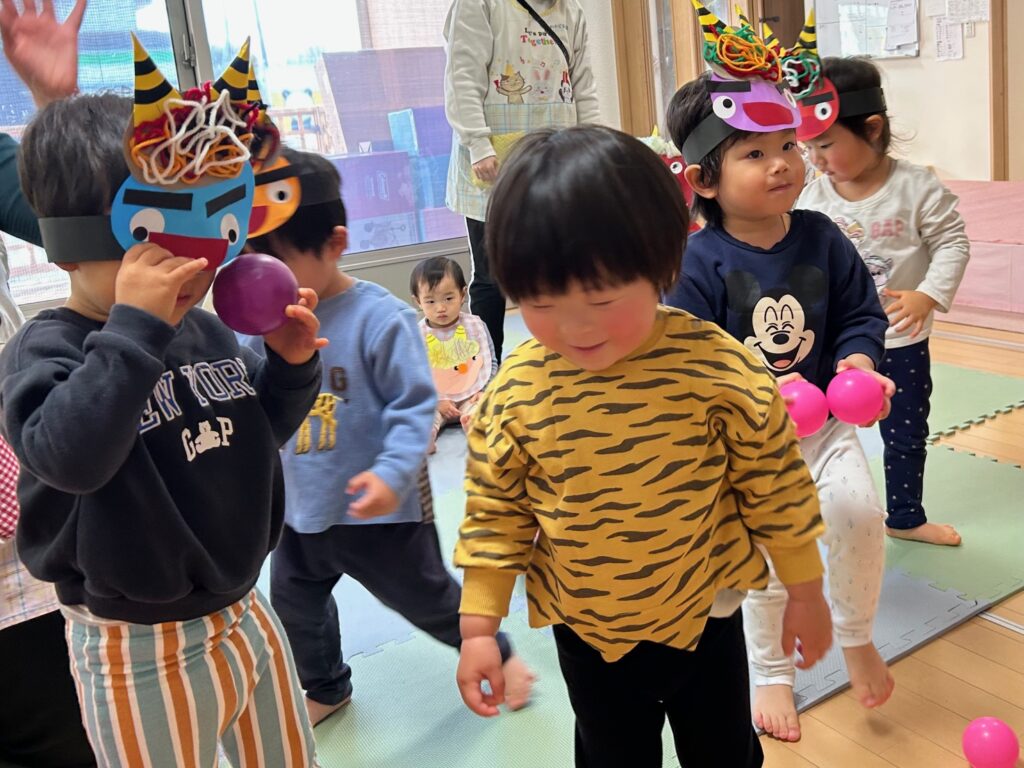 みんなで“豆まき”を歌ったり“おにのパンツ”を踊ったりして楽しんだあと、ボールを豆に見立てて鬼退治をしました。どの子も張り切って豆まきをすることができていました。