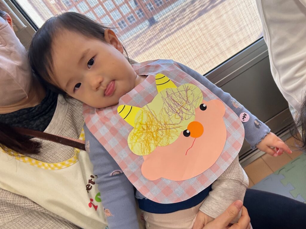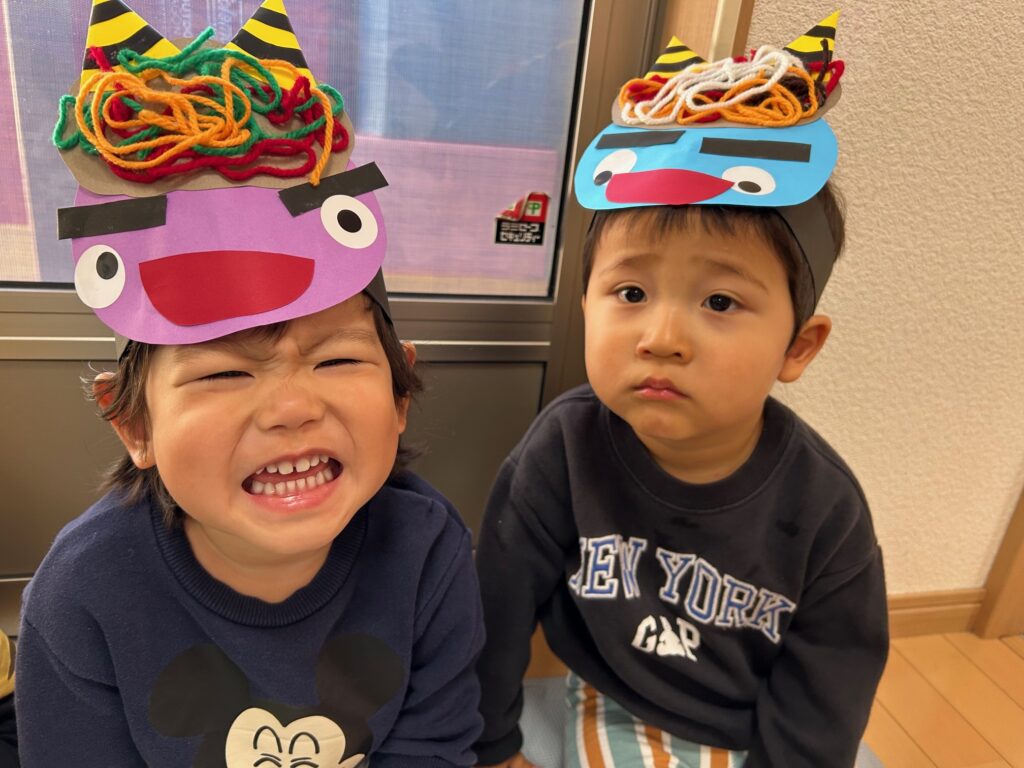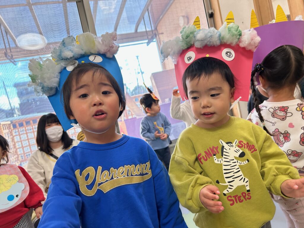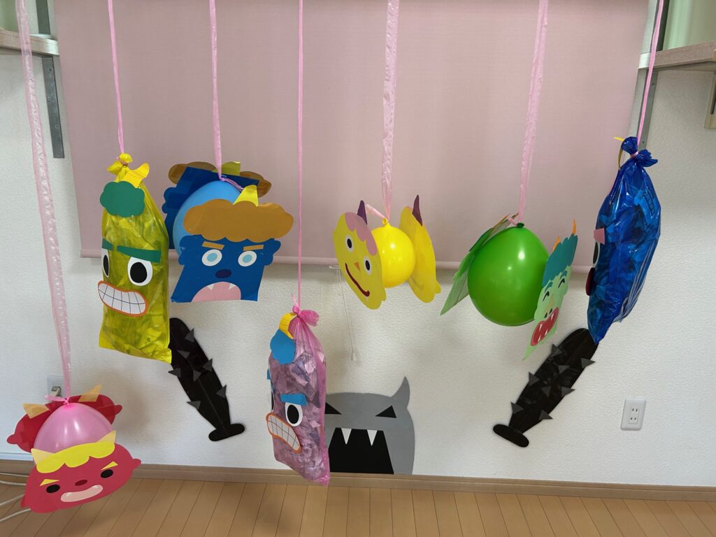 みんなで“豆まき”を歌ったり“おにのパンツ”を踊ったりして楽しんだあと、ボールを豆に見立てて鬼退治をしました。どの子も張り切って豆まきをすることができていました。