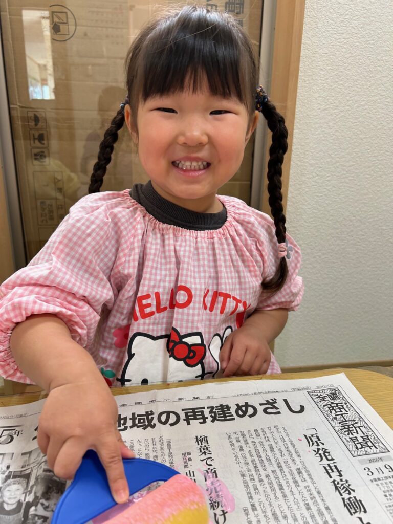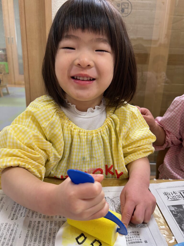 ローラーに絵の具をつけて、「コロコロ~!」と言いながら楽しそうに塗っていました。