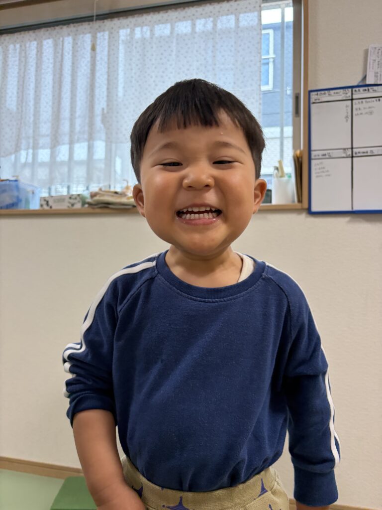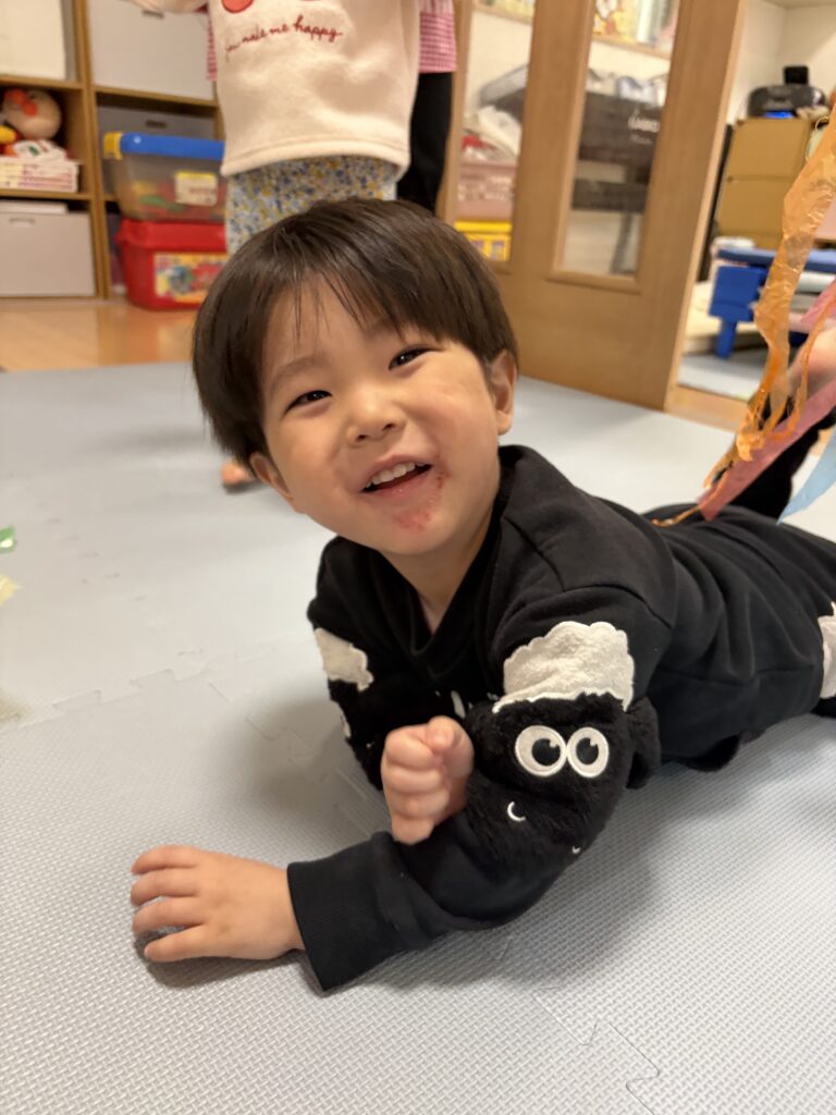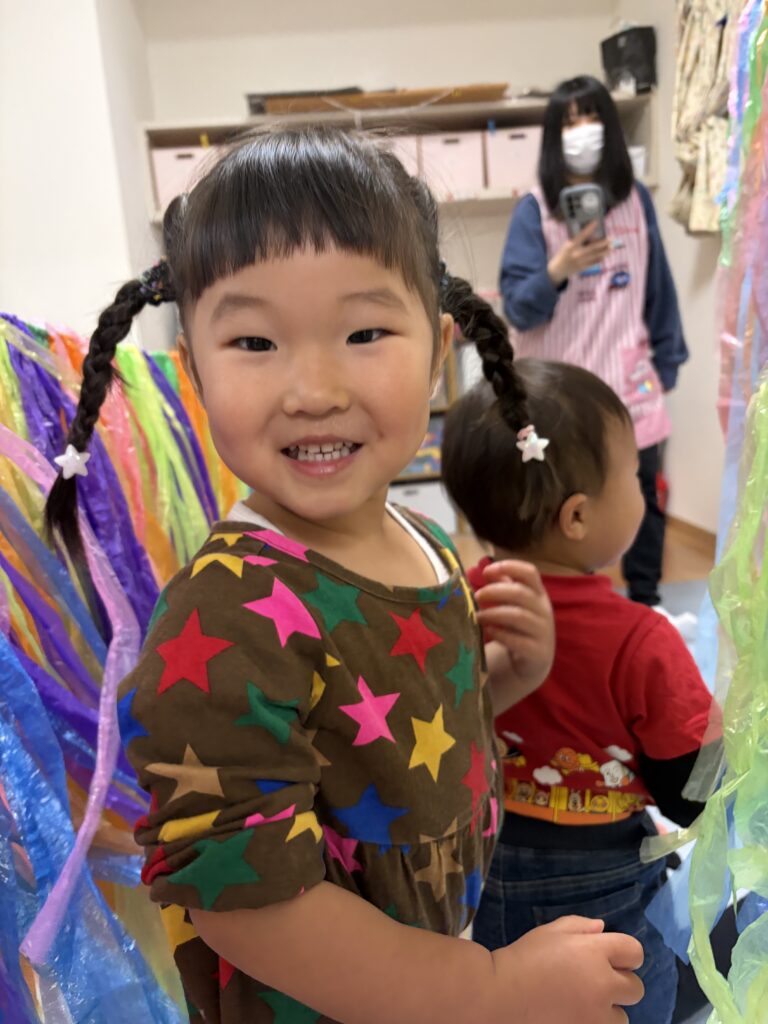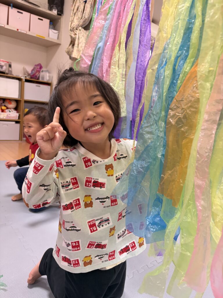 今日は、お部屋にソフトブロックコーナー、マット山コーナー、すずらんテープのカーテンコーナー、を設置して、遊びました。室内でも元気いっぱい体を動かしました!