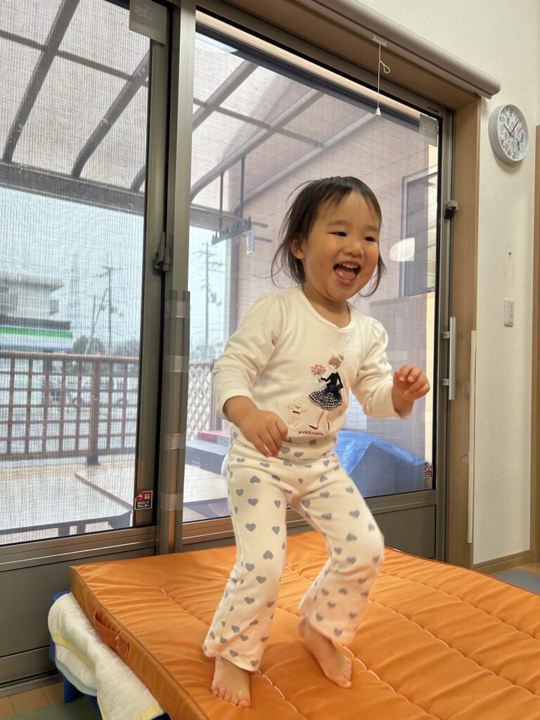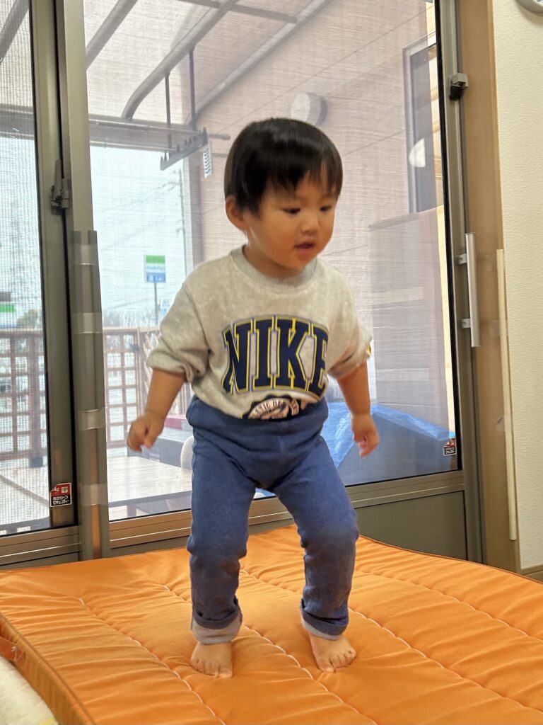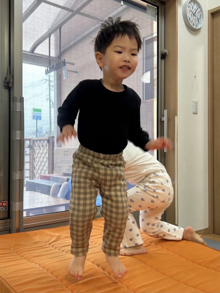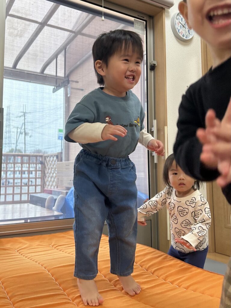 今日は、お部屋にソフトブロックコーナー、マット山コーナー、すずらんテープのカーテンコーナー、を設置して、遊びました。室内でも元気いっぱい体を動かしました!