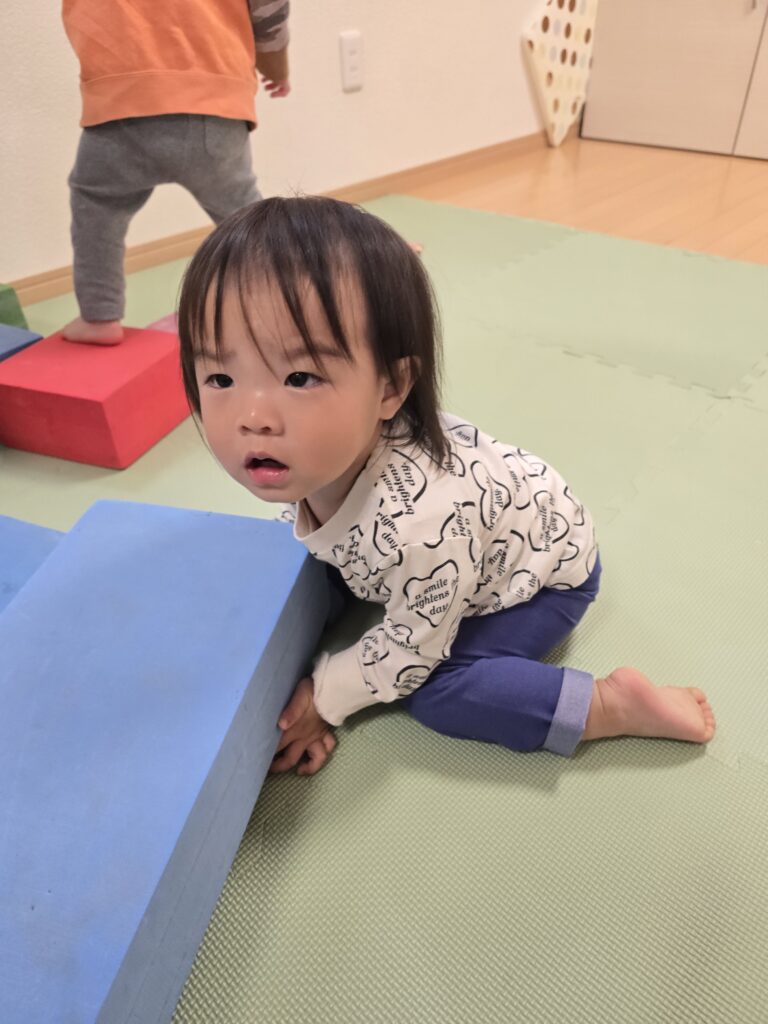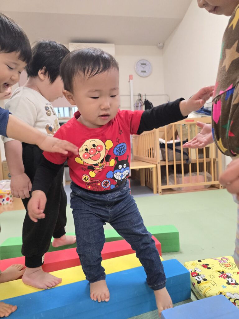 マット山に登ったり、すずらんカーテンをくぐったりして身体を動かしました。