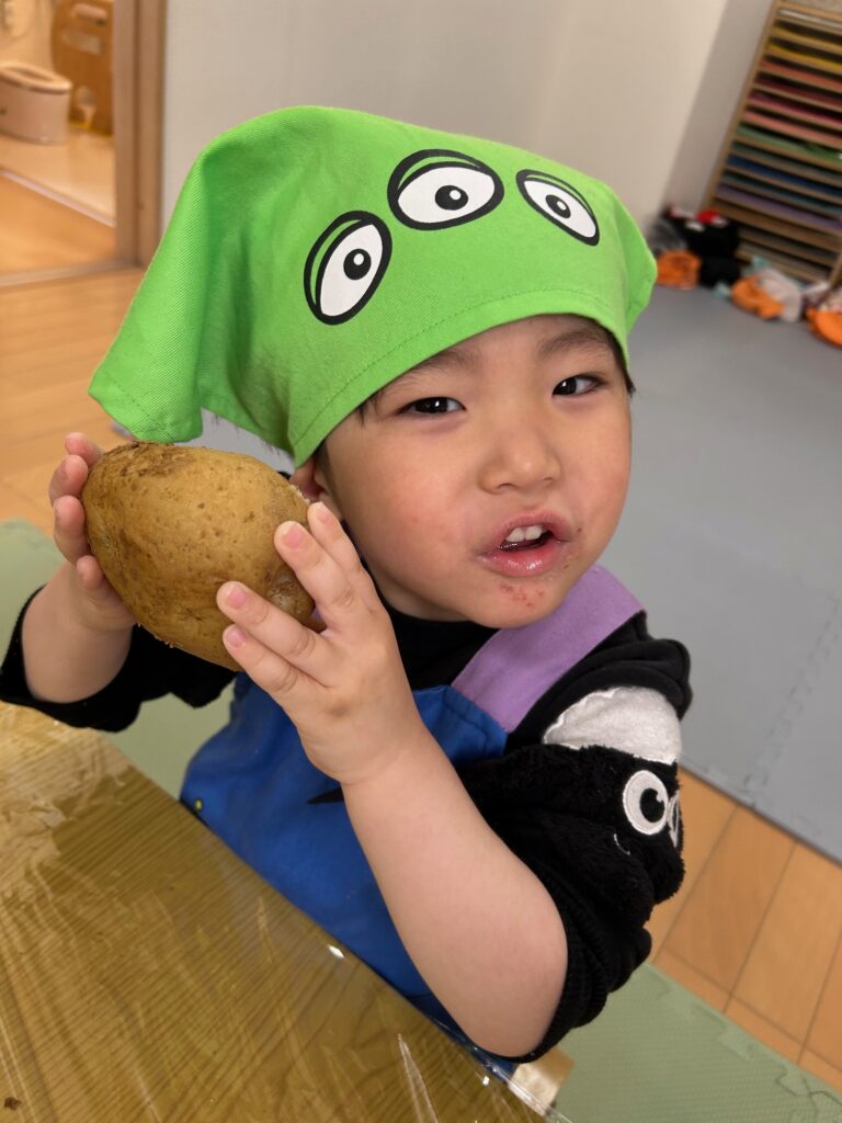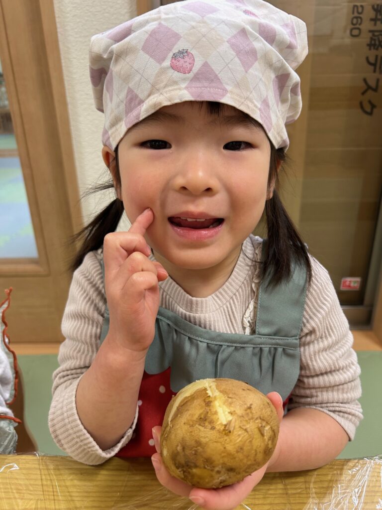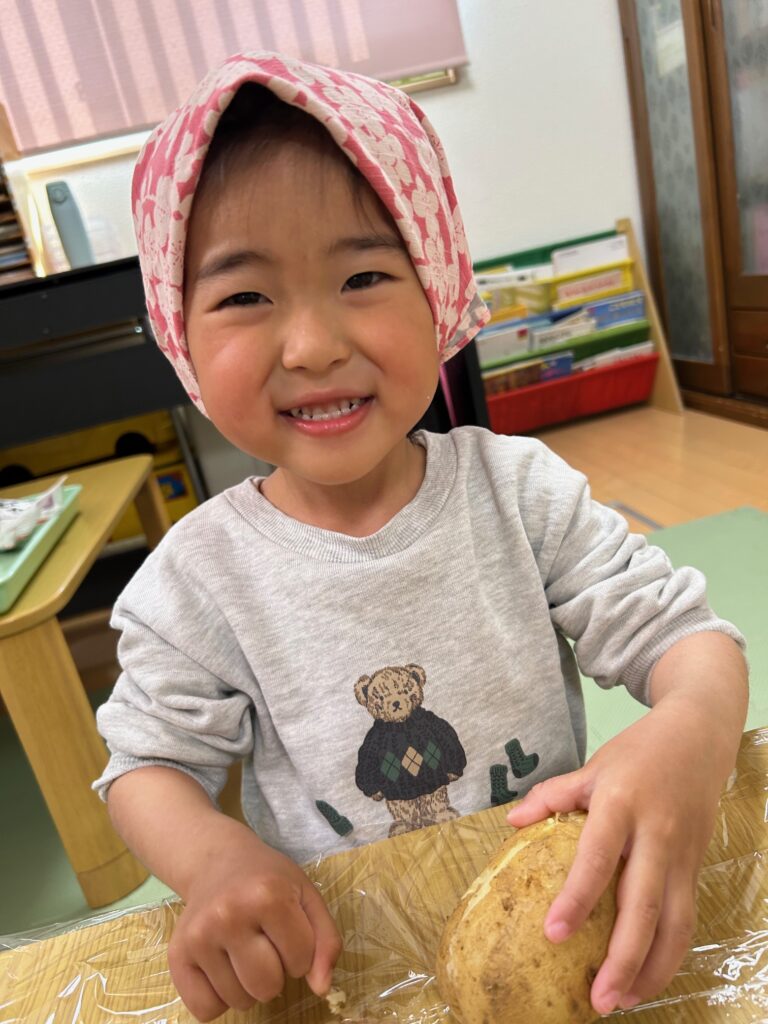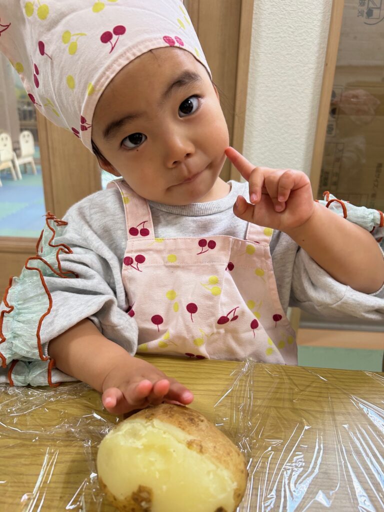 じゃがいもの皮をむいて「うんとこしょ、どっこいしょ」とかけ声をしながらじゃがいもを潰し、「美味しくなあれ!」と言いながら丸めて楽しんでいました。