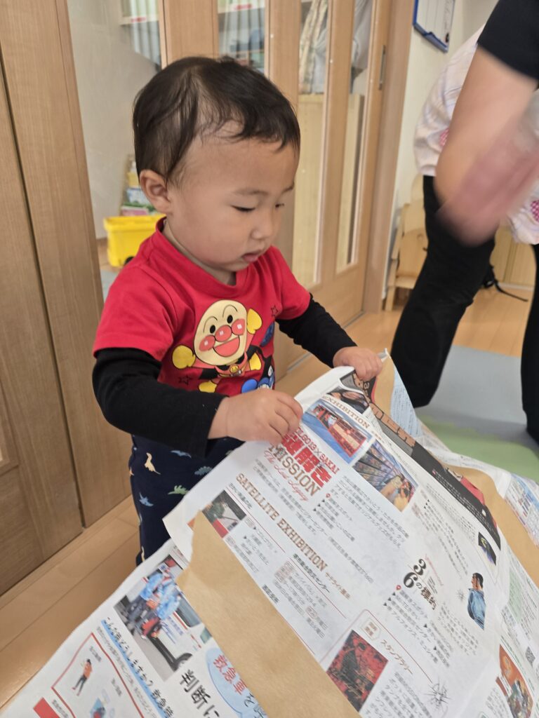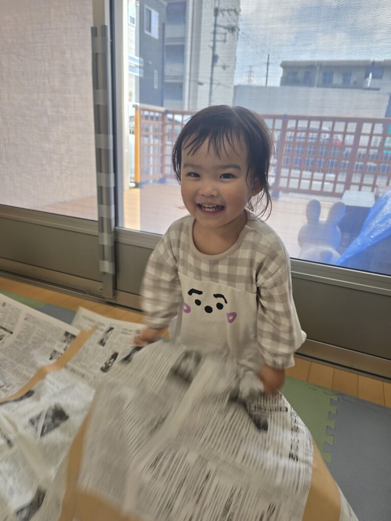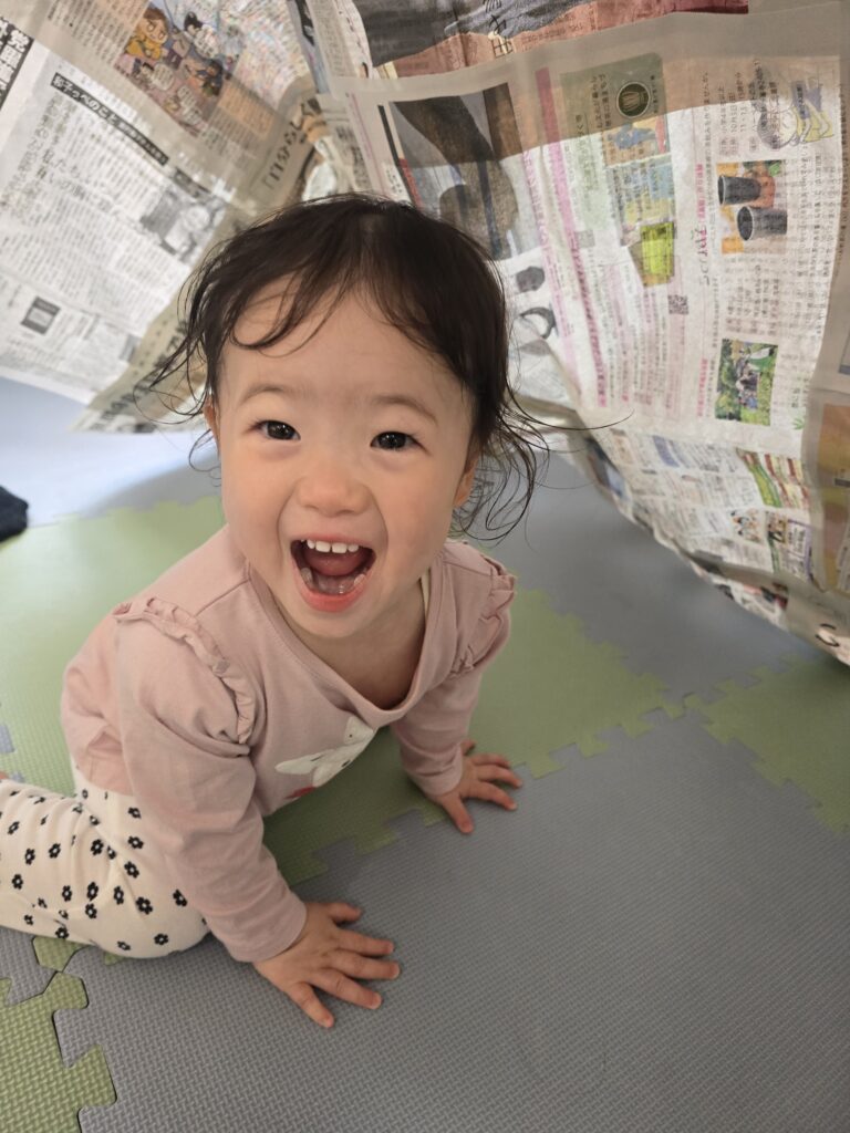 たくさんつなげて大きくしてパラバールンのようにすると、大喜びで中に入ったりカサカサという音を楽しんだりしていました。