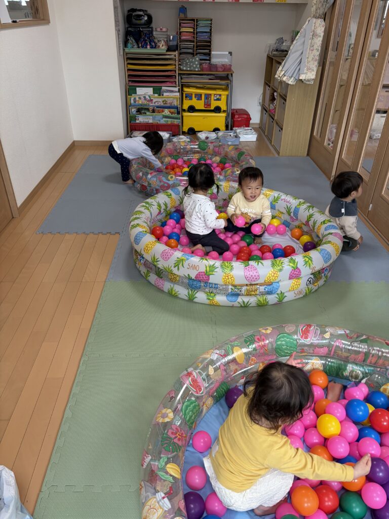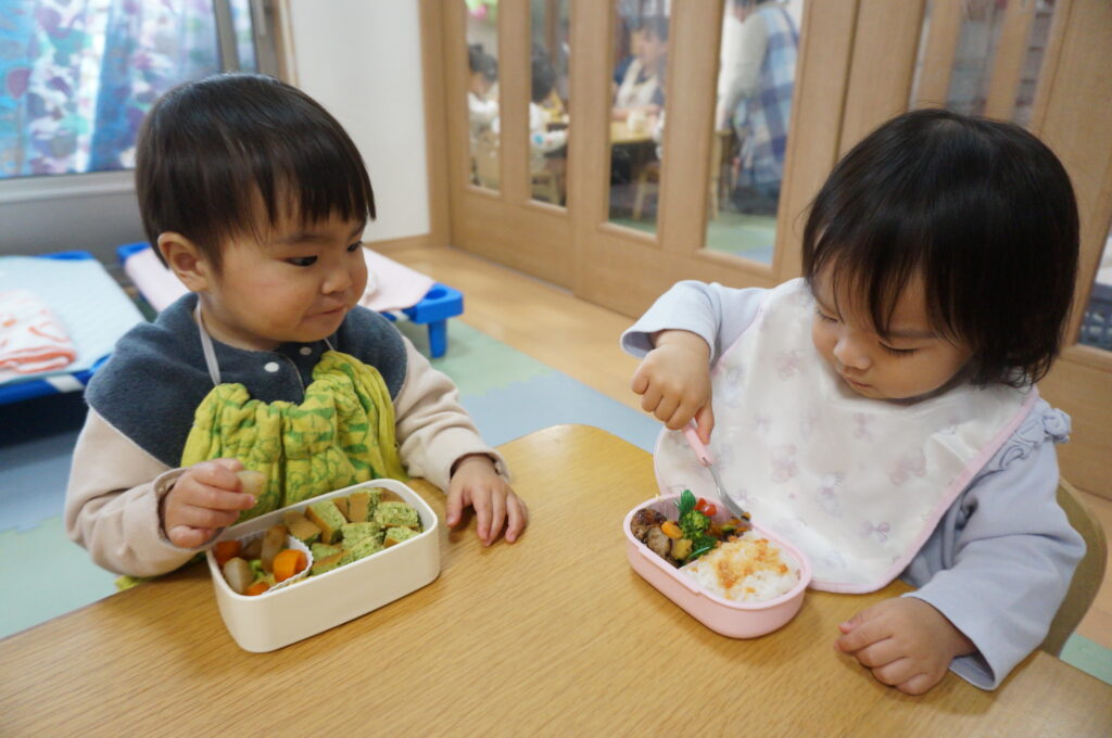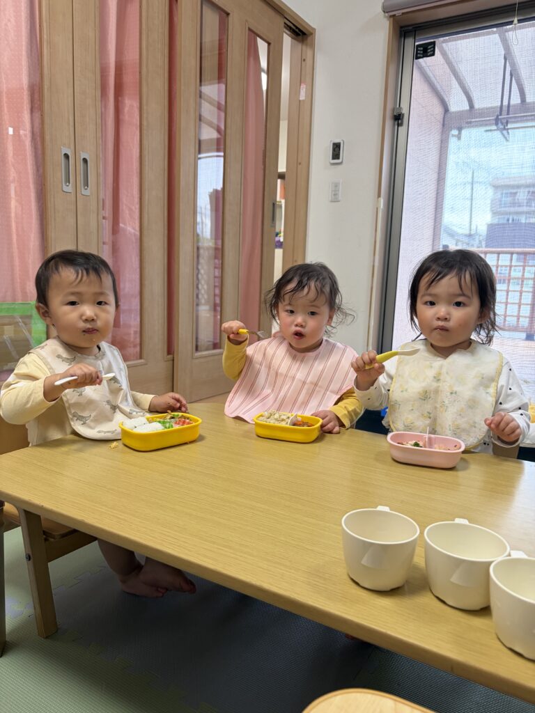今日は、お弁当の日でした。お忙しい中、お弁当作りありがとうございました。みんなのワクワクが登園時から伝わってきました!お部屋で、ボールプールや、マットで遊んだ後は、お待ちかねのお弁当の時間です!とてもニコニコと嬉しそうに食べ進めていました。