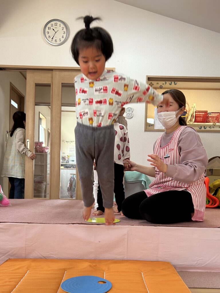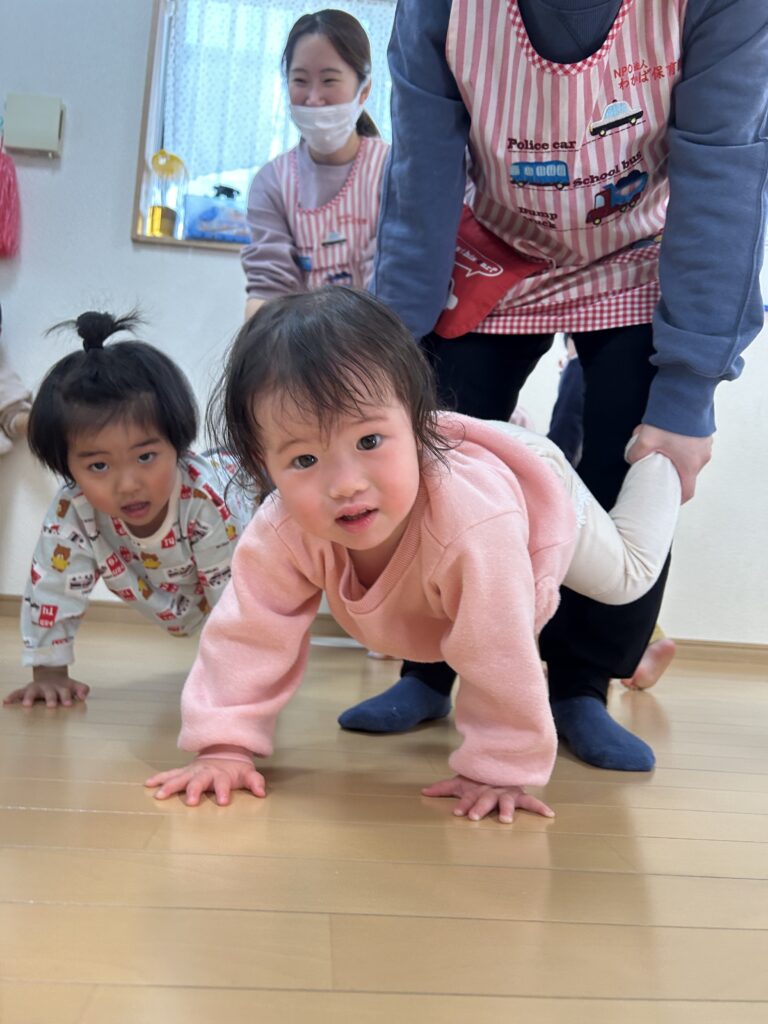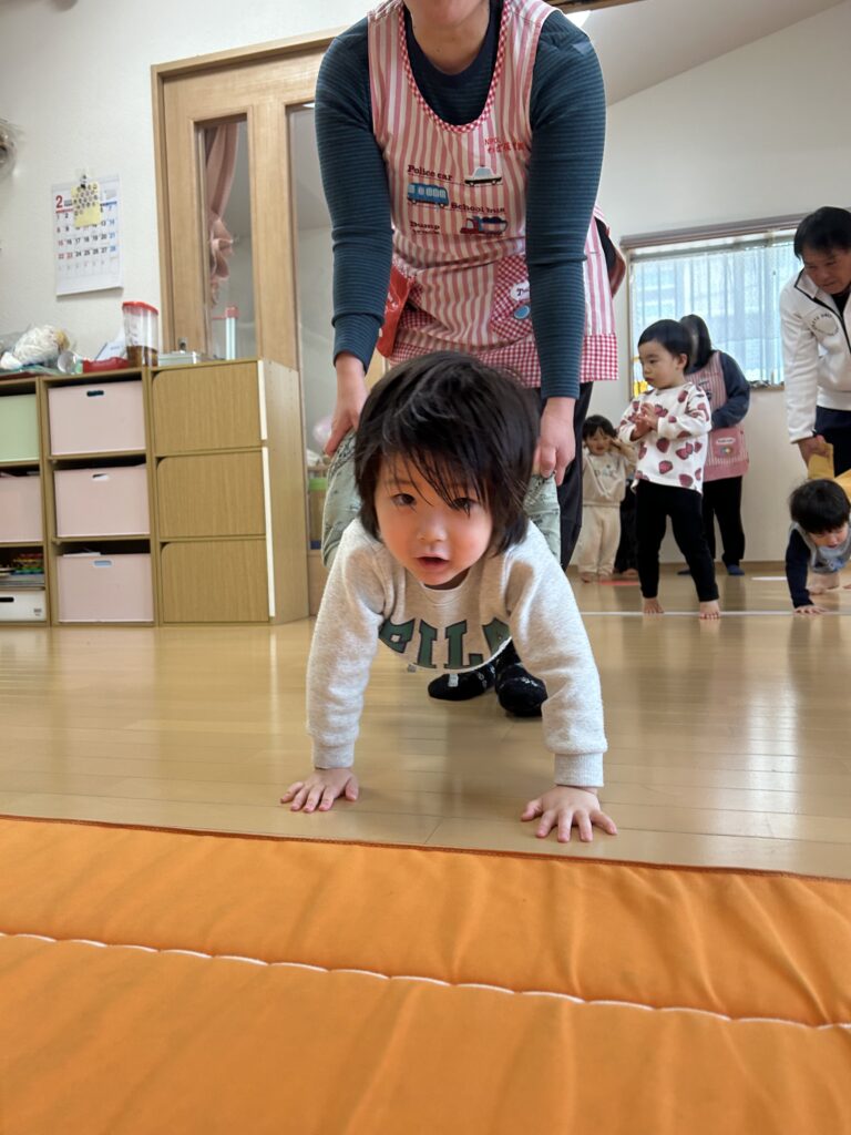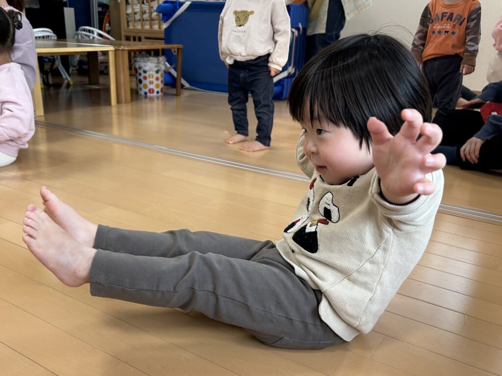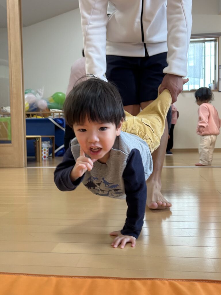 みんなが大好きな体操教室がありました。かけっこ ジャンプ 手押し車色々な運動を頑張りました。