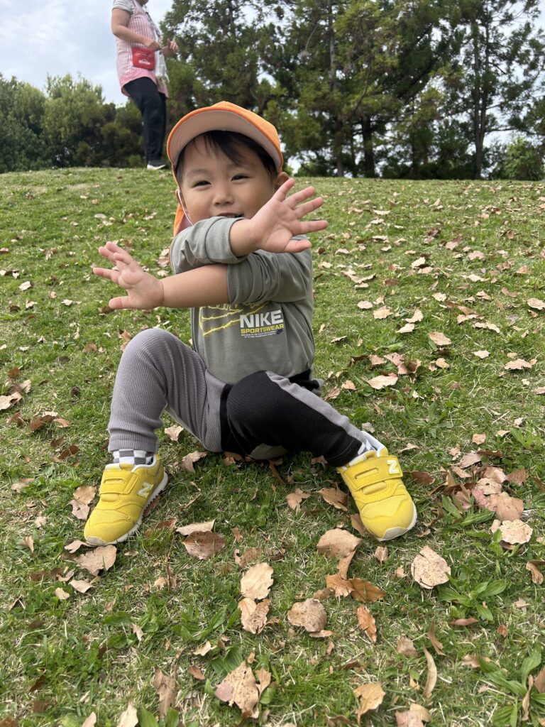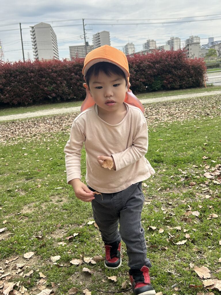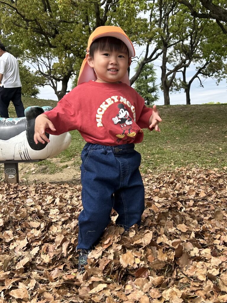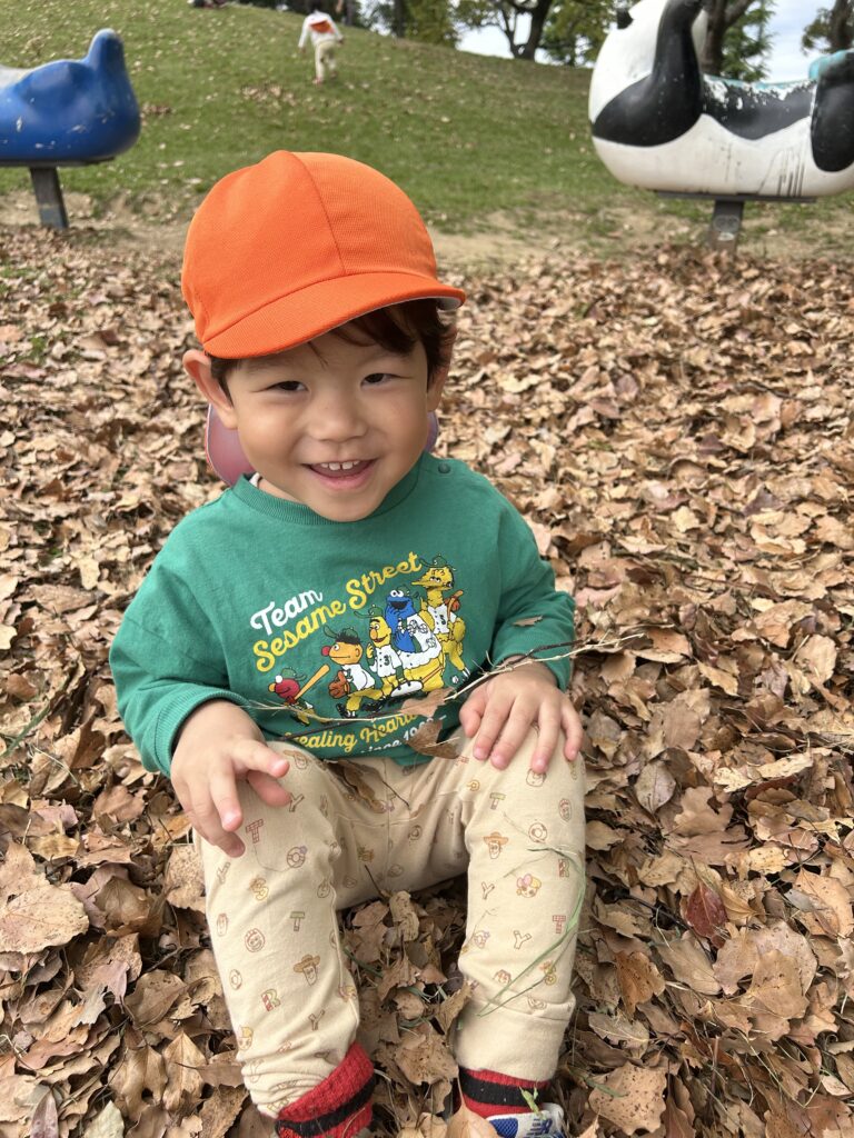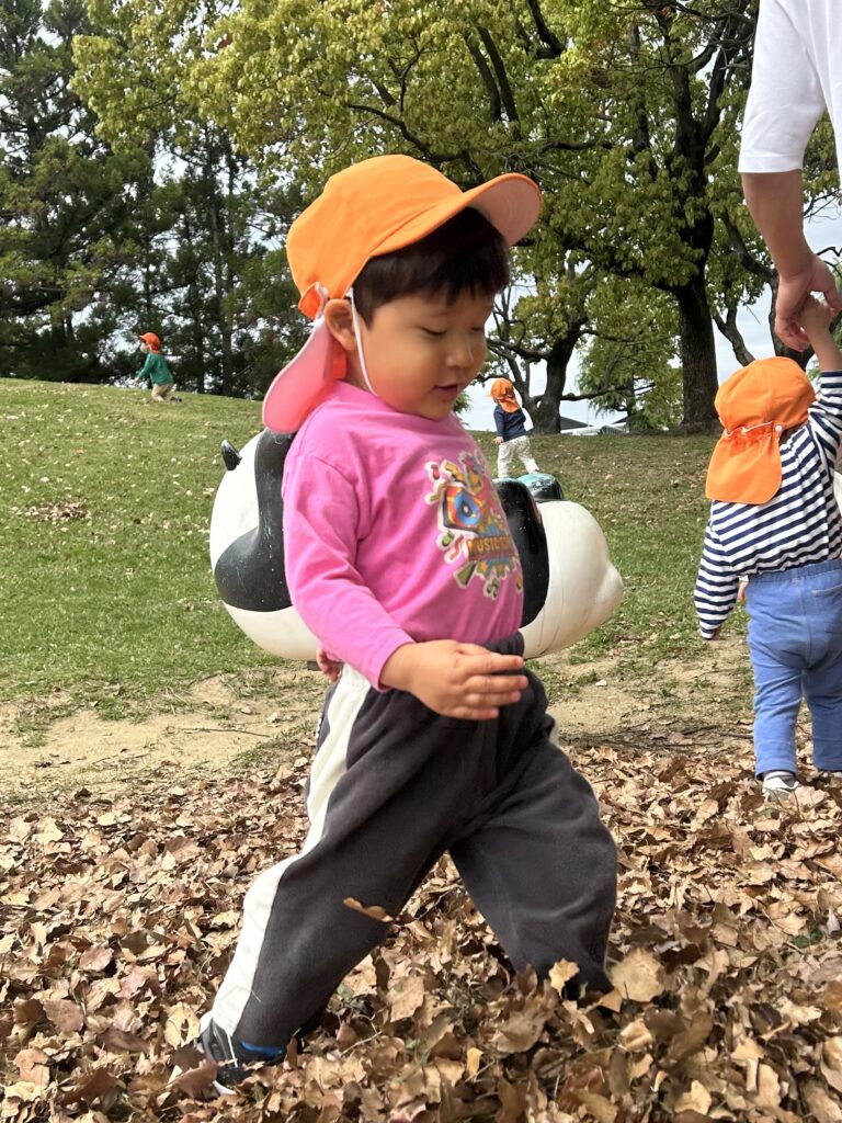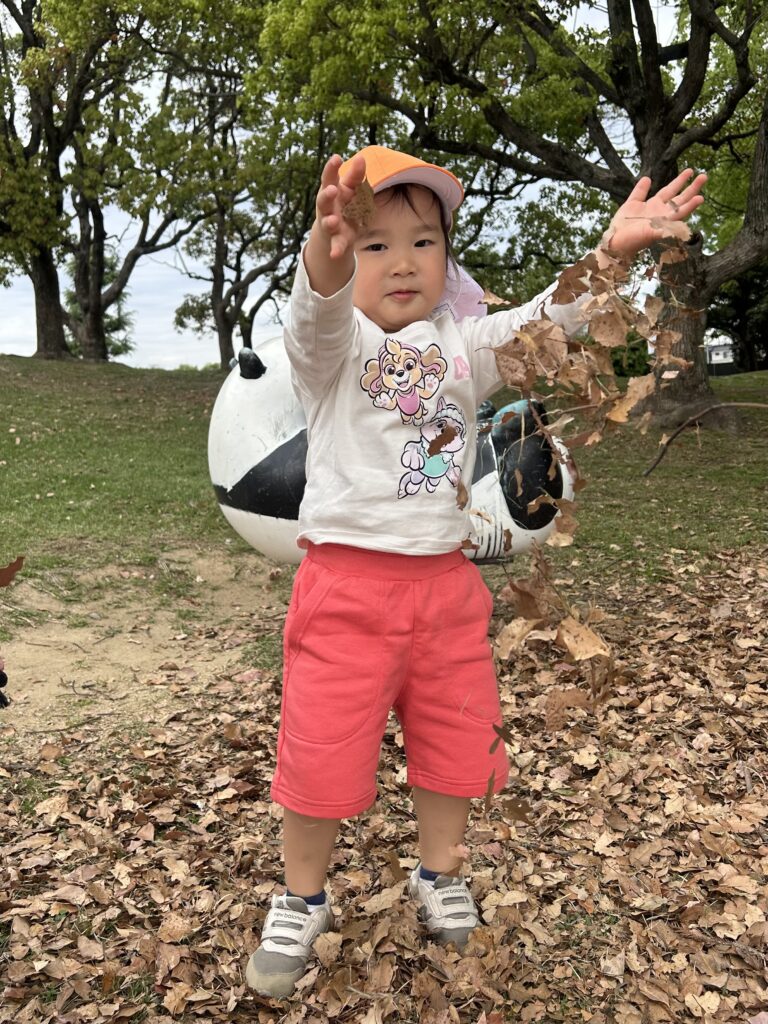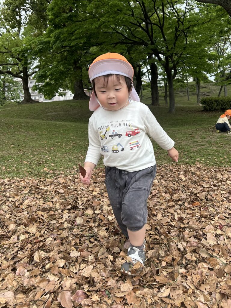 金岡公園に行きました。落ち葉の感触を楽しんだり音を楽しんだりしていました。そのあとは元気いっぱい走り回っていました。
