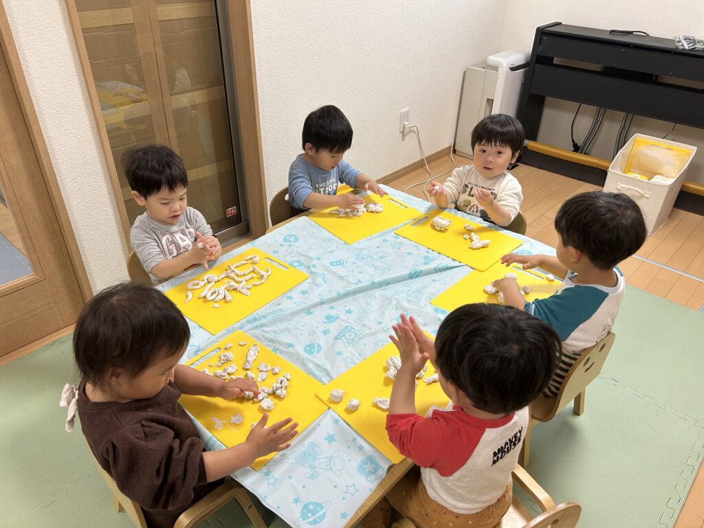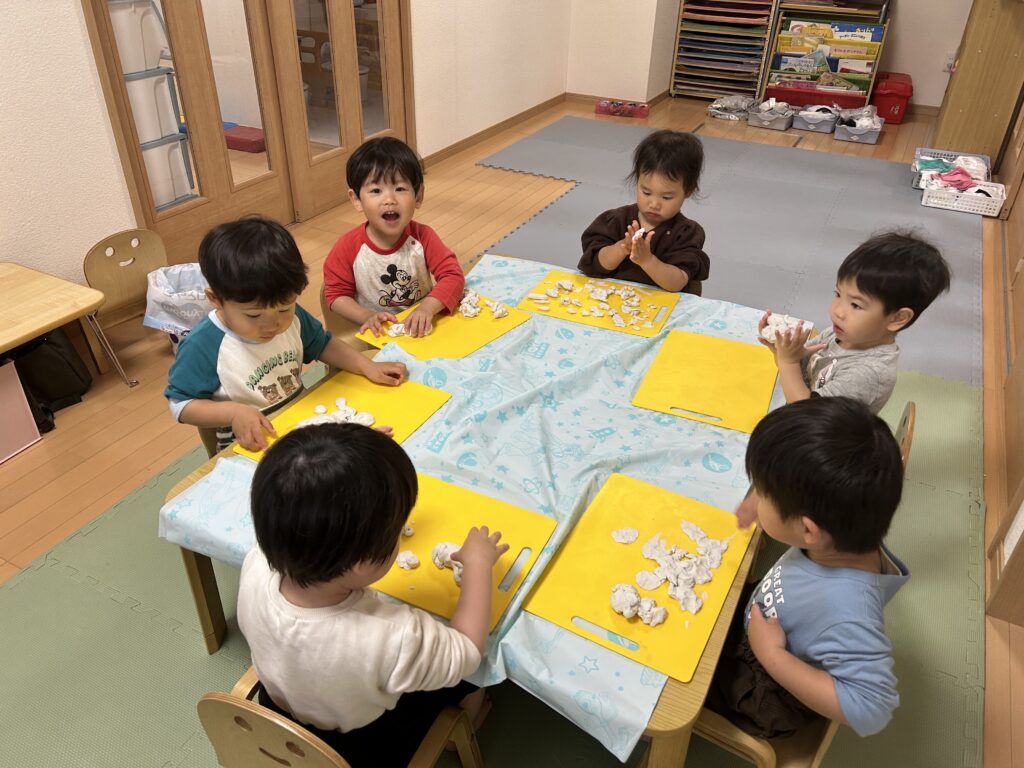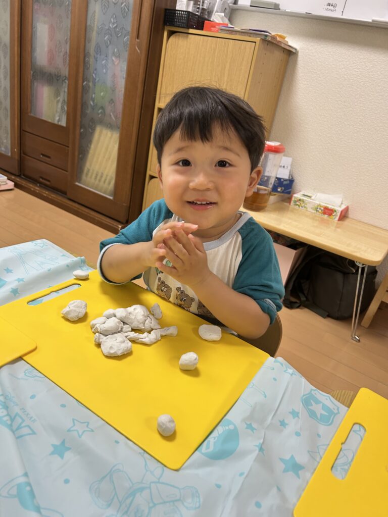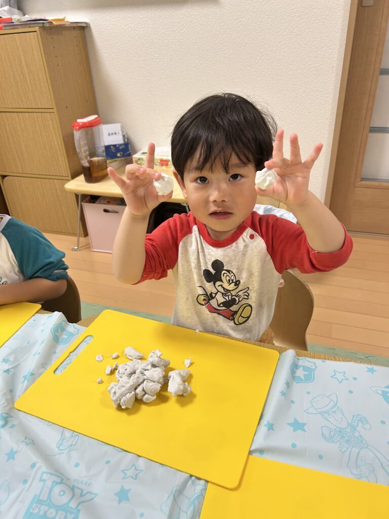 粘土遊びをしました。久しぶりだったのでどの子も楽しそうに両手で丸めたり細かくちぎったりと思い思いに遊んでいました。