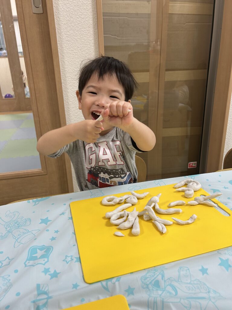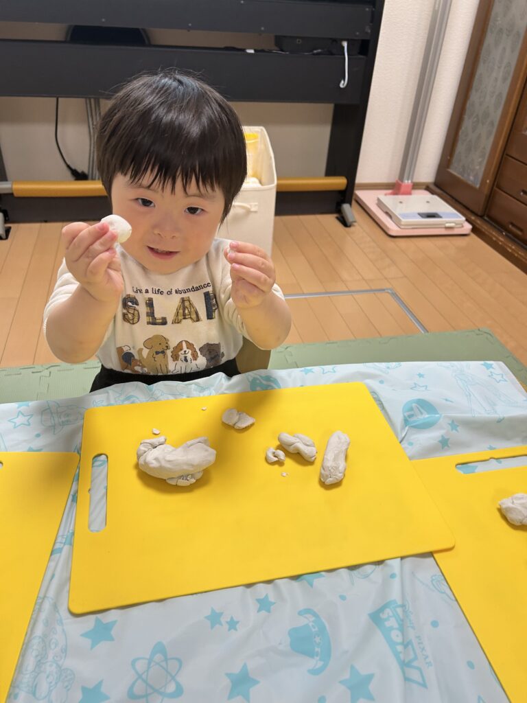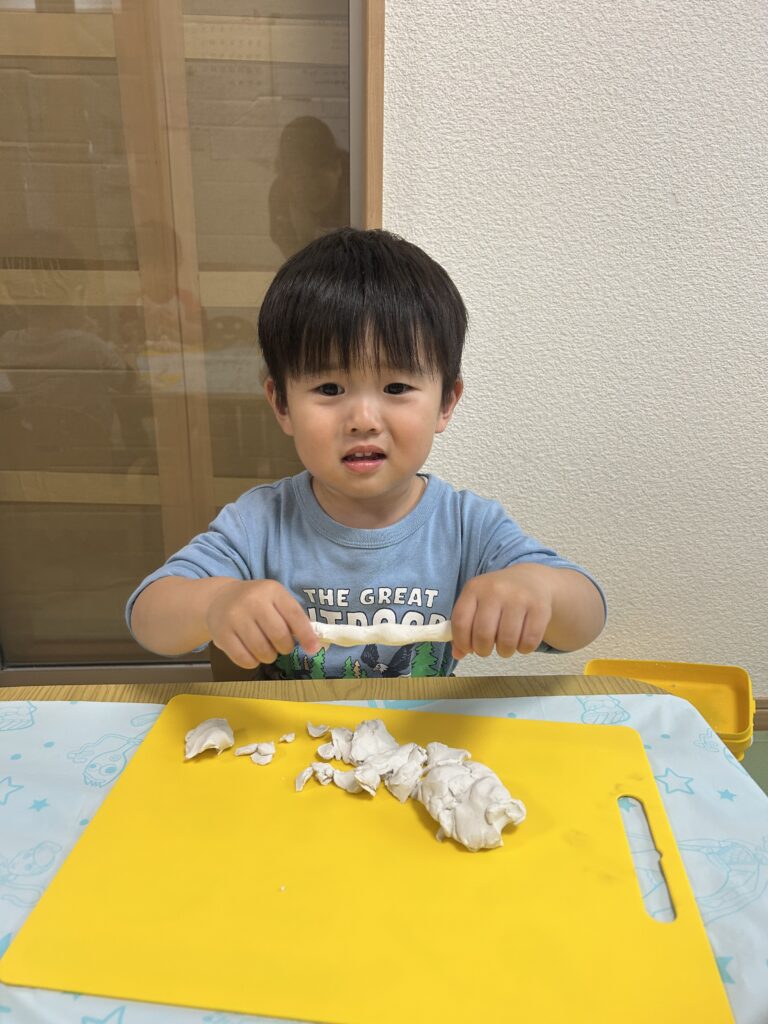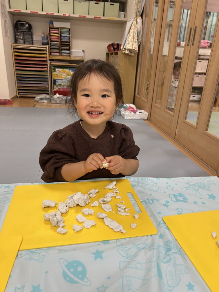 粘土遊びをしました。久しぶりだったのでどの子も楽しそうに両手で丸めたり細かくちぎったりと思い思いに遊んでいました。