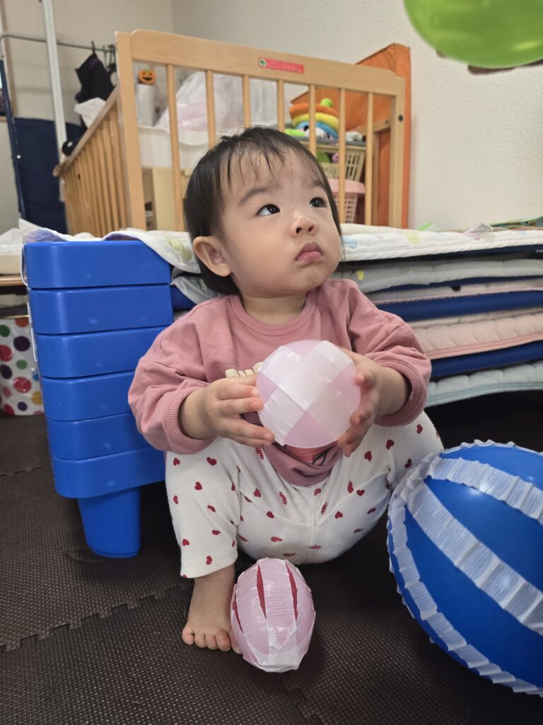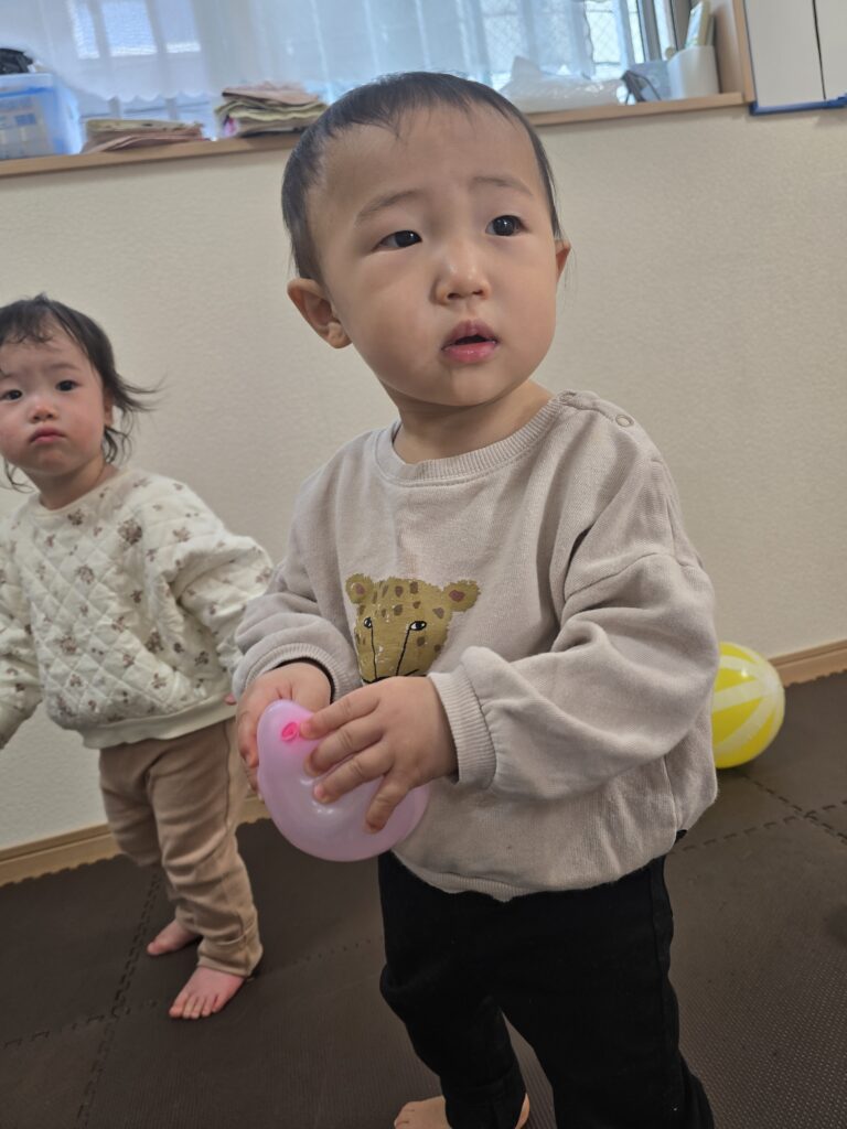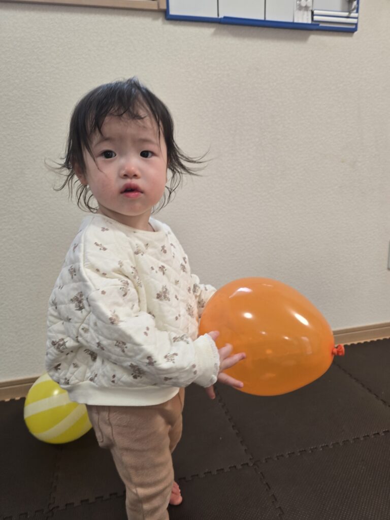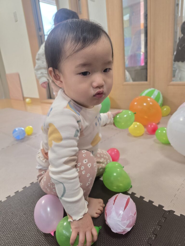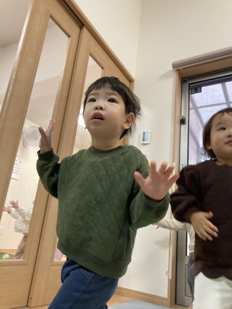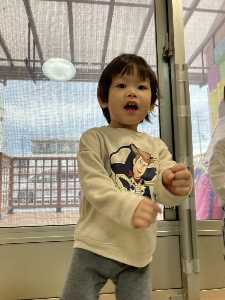 風船で遊んだり、うさぎ組さんのお部屋も開放してもらい一緒にトンネルをしたりしました。