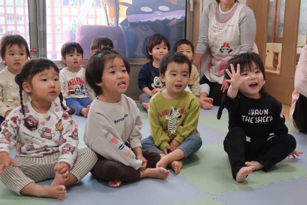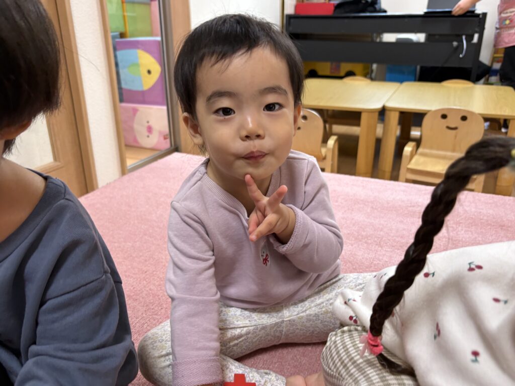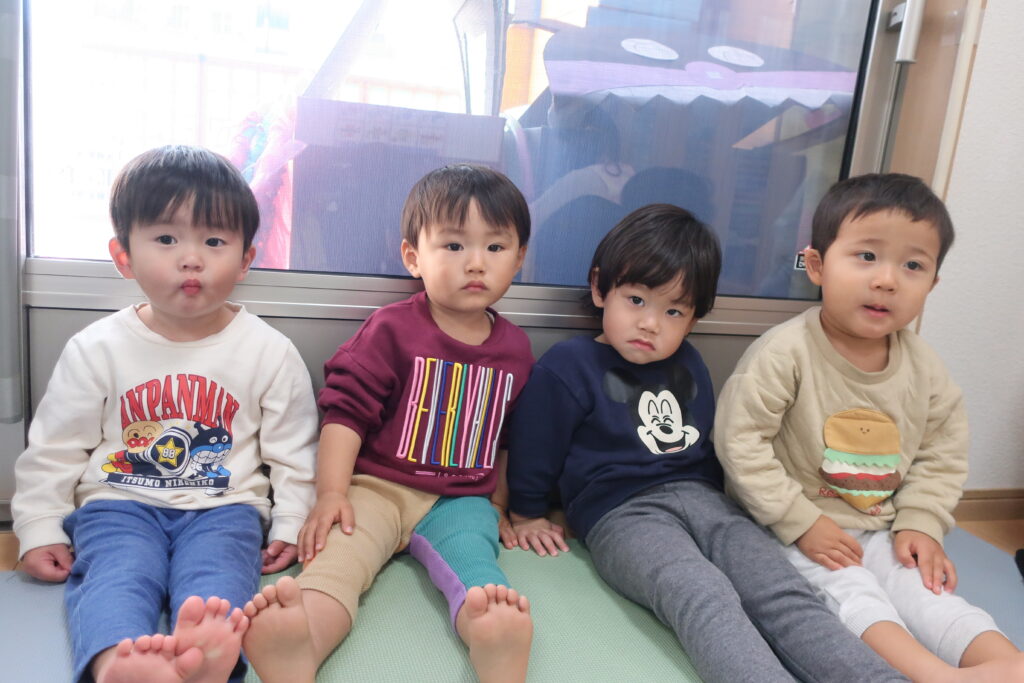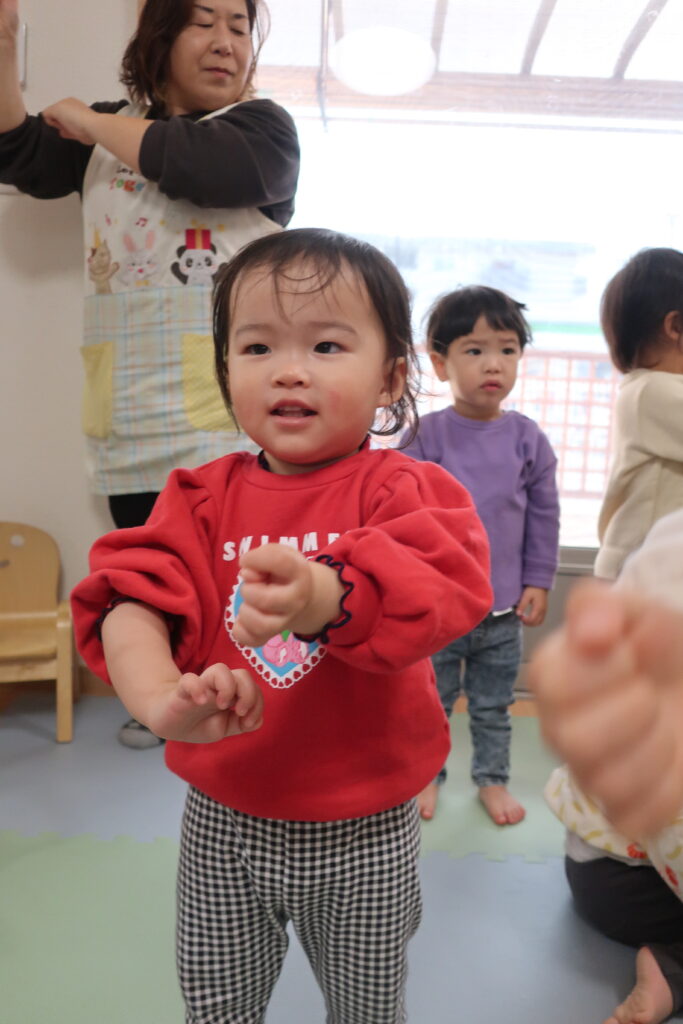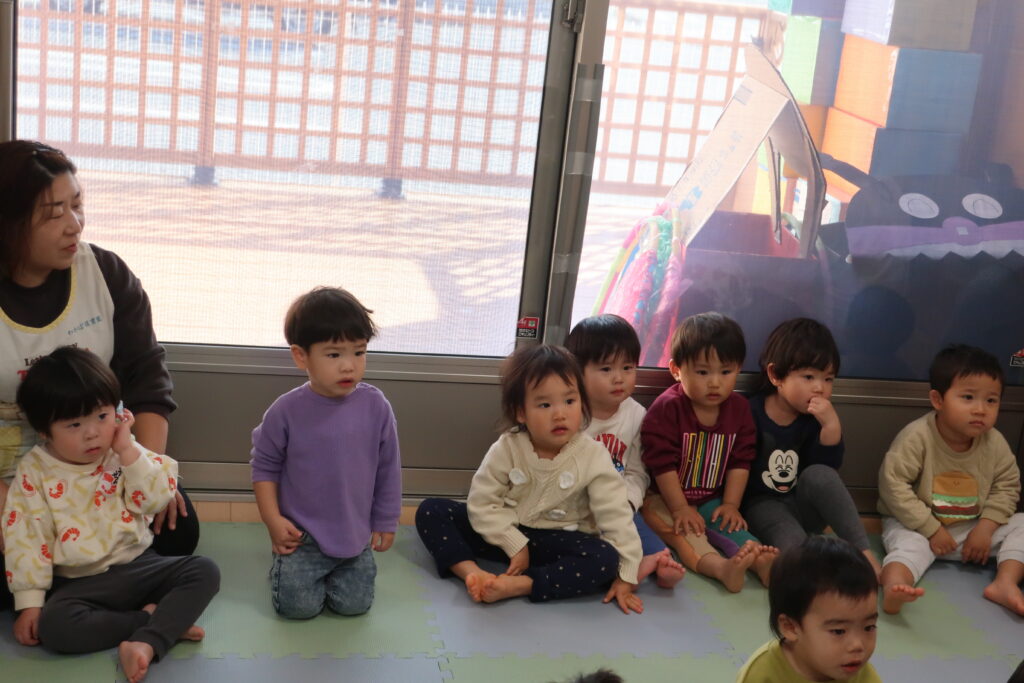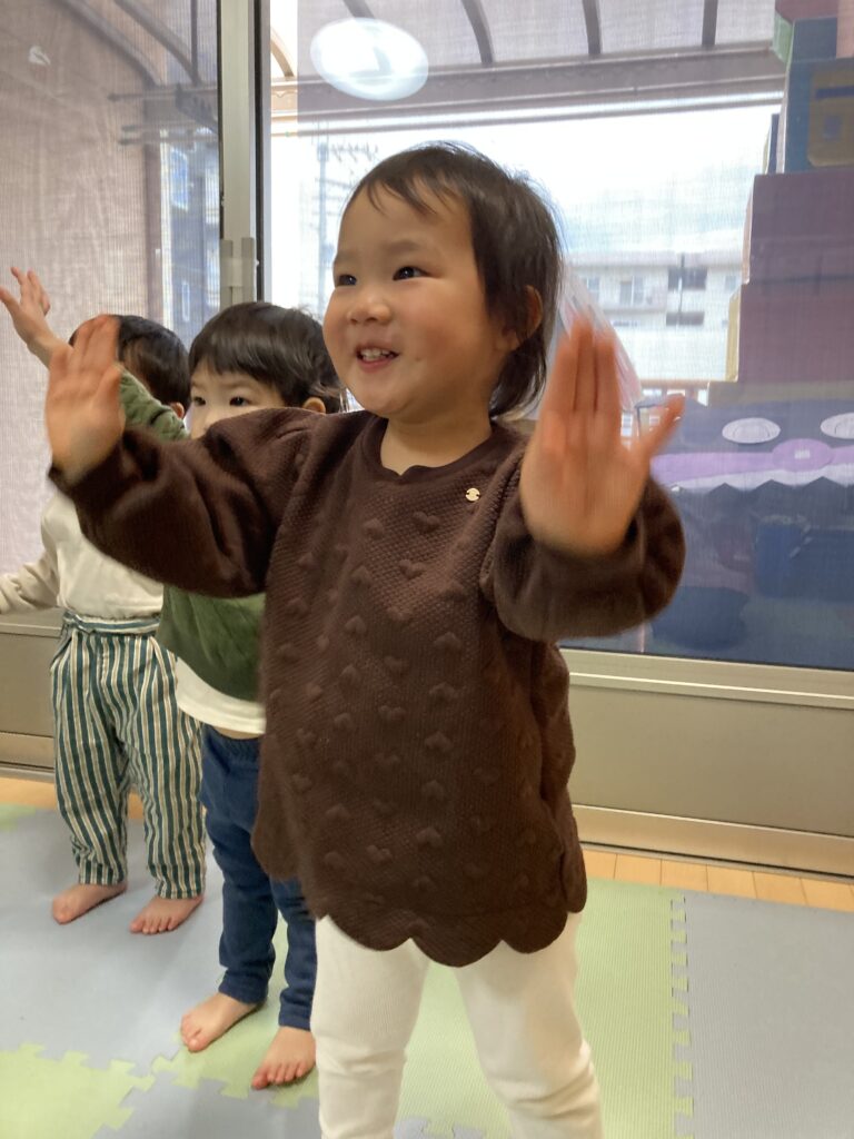 今日は、避難訓練をした後、お歌の練習をしました。元気いっぱい歌った後は、お部屋でトンネルを使い遊び、体をたくさん動かしました。