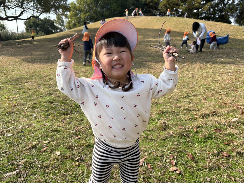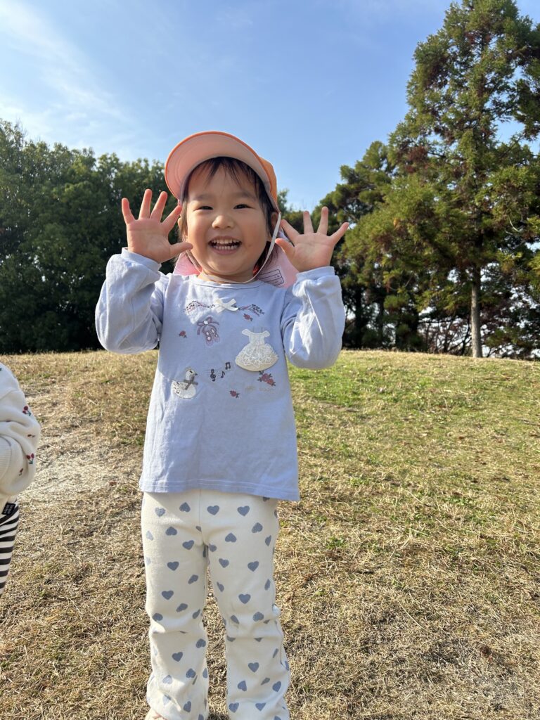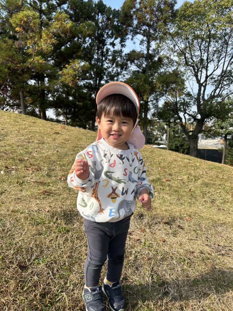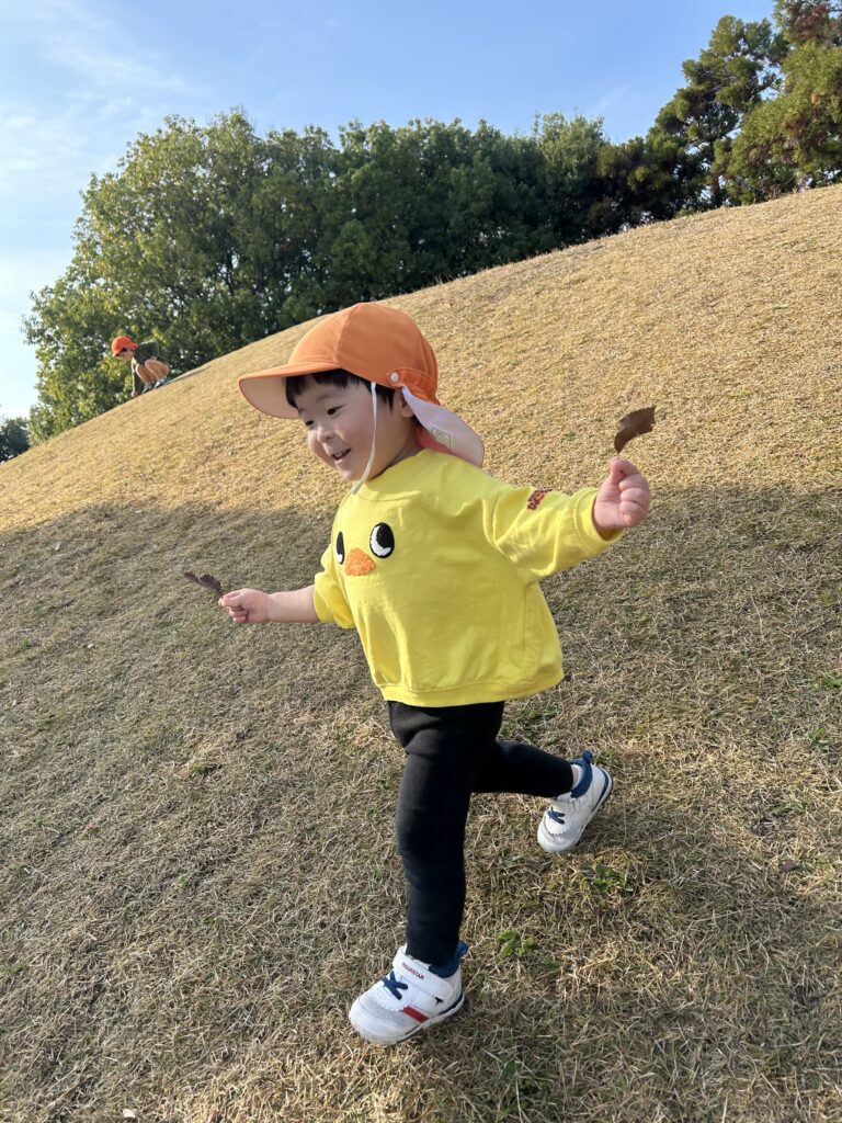 今日もくま組さんに手をつないでもらい金岡公園に行きました。丘の登り降りを楽しんだり丘の上からかけおりたりと元気いっぱい遊びました。