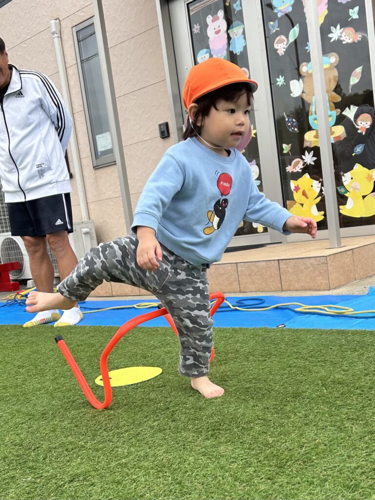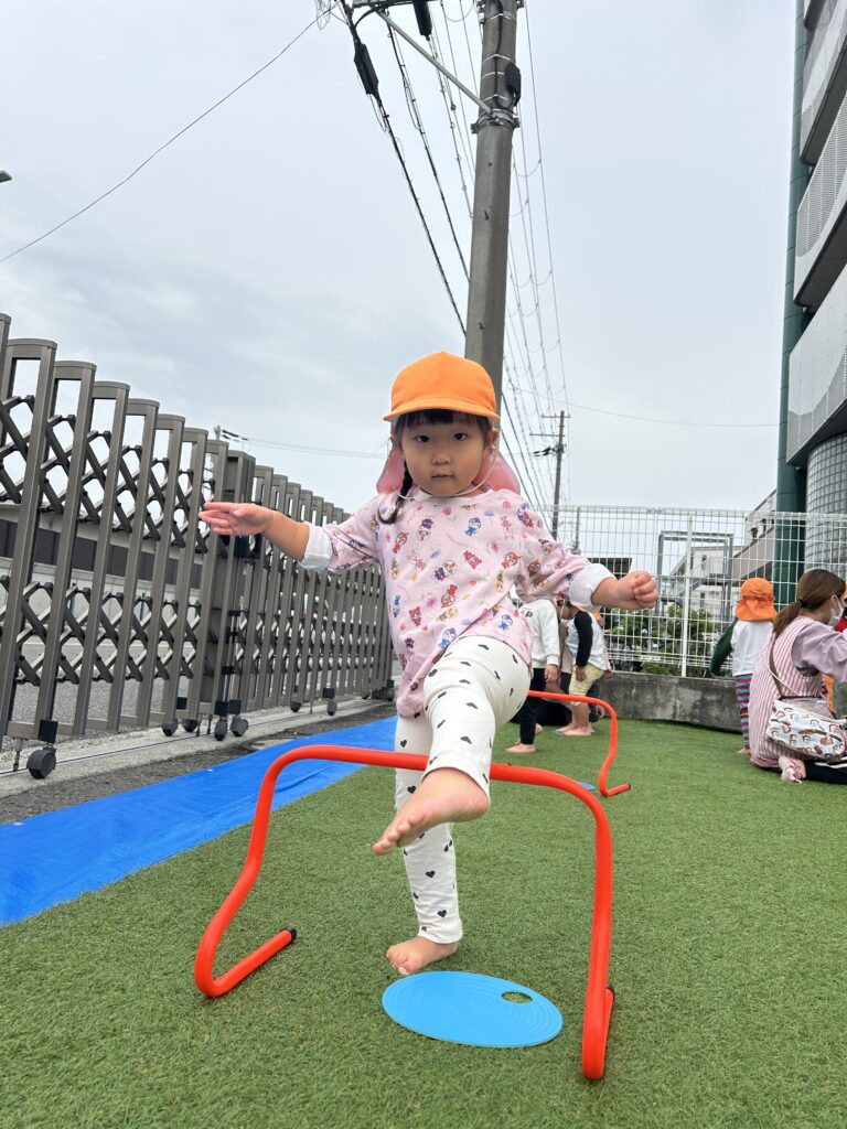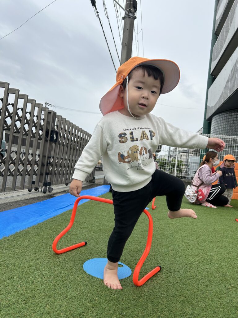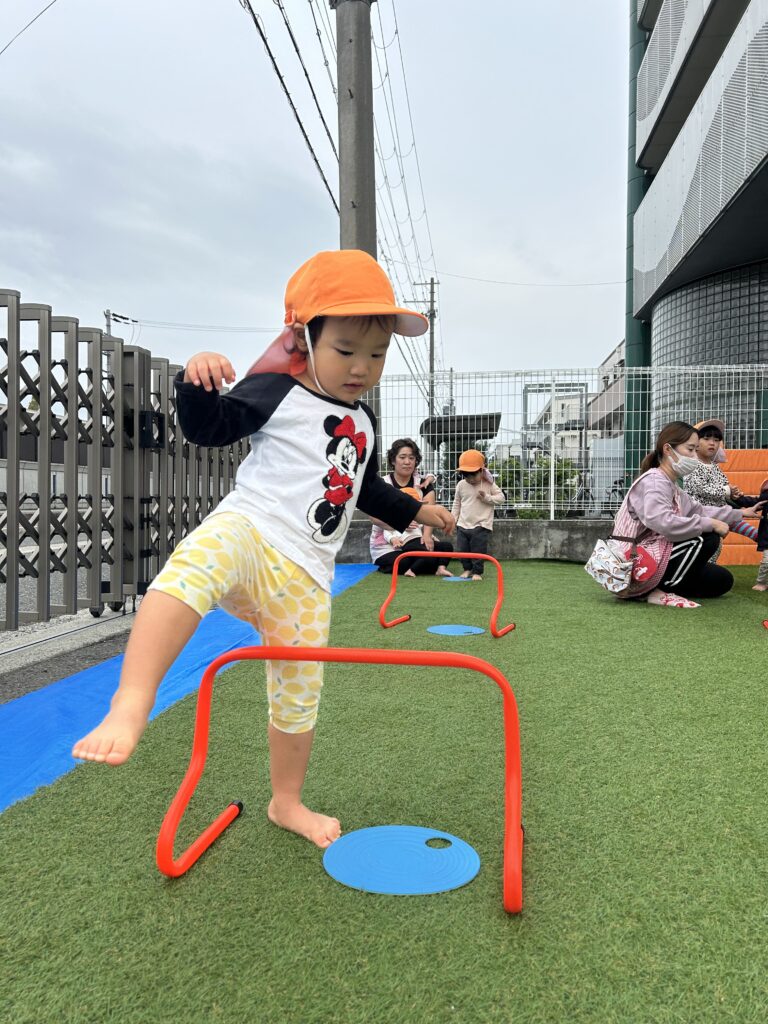 みんな体操教室が大好きですごくいい顔で参加しています。初めてのハードルを使いました。またぐのに一生懸命足を上げたり鉄棒や平均台でも新しいことに挑戦しました。