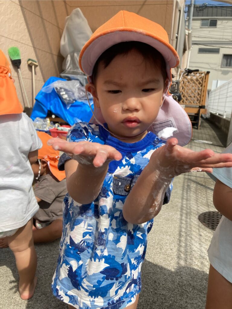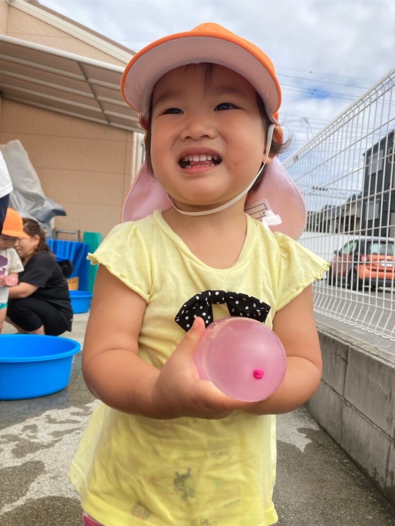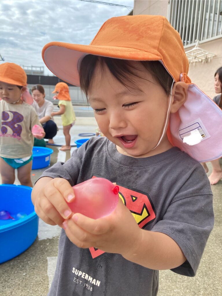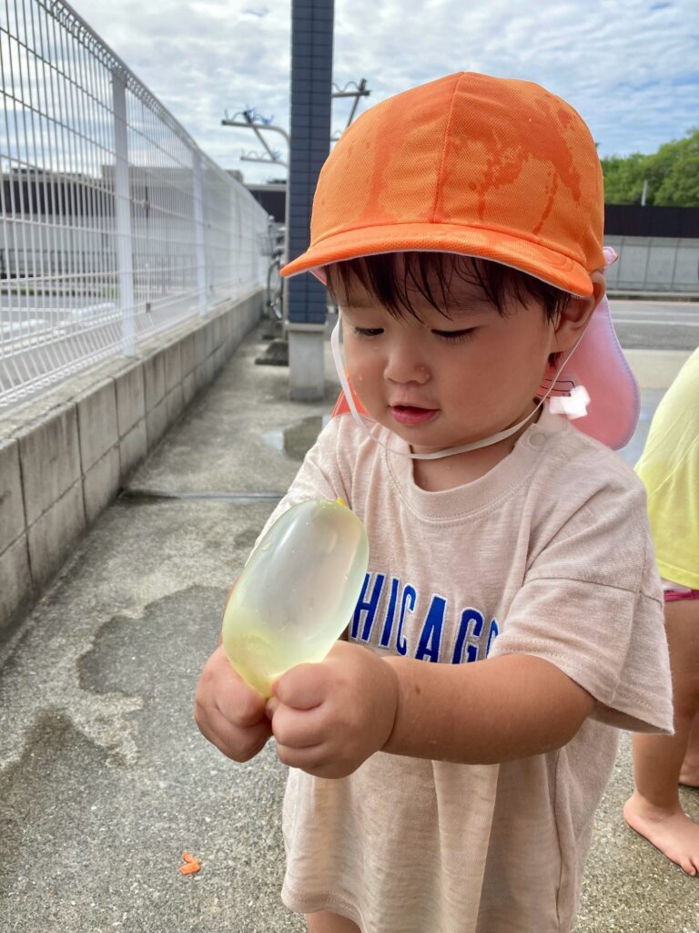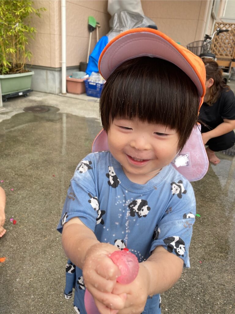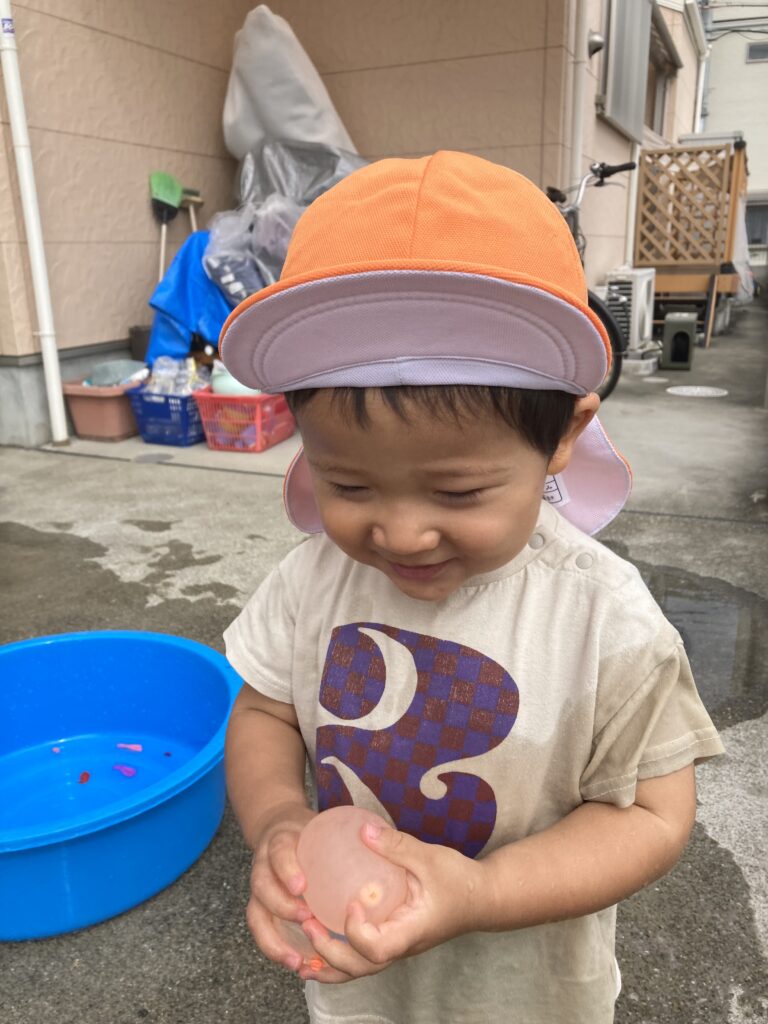 ぷにぷにの水風船を掴んだり、ギュッと握って割ってみたりと、それぞれに感触を楽しんでいたうさぎ組さんでした!